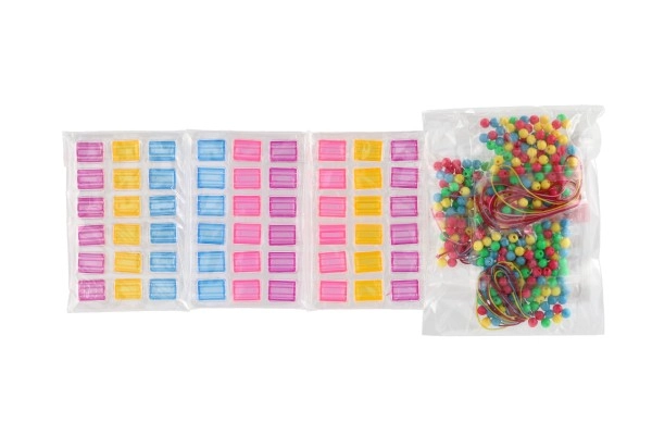 Pestré korálky, čtvercové dílky, gumičky a samolepky – stačí otevřít a začít tvořit bez dalších nákupů.