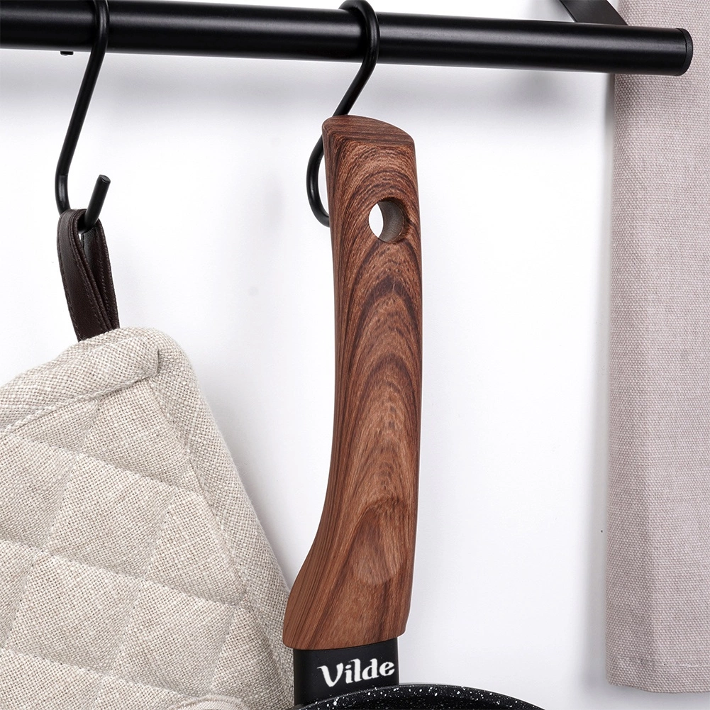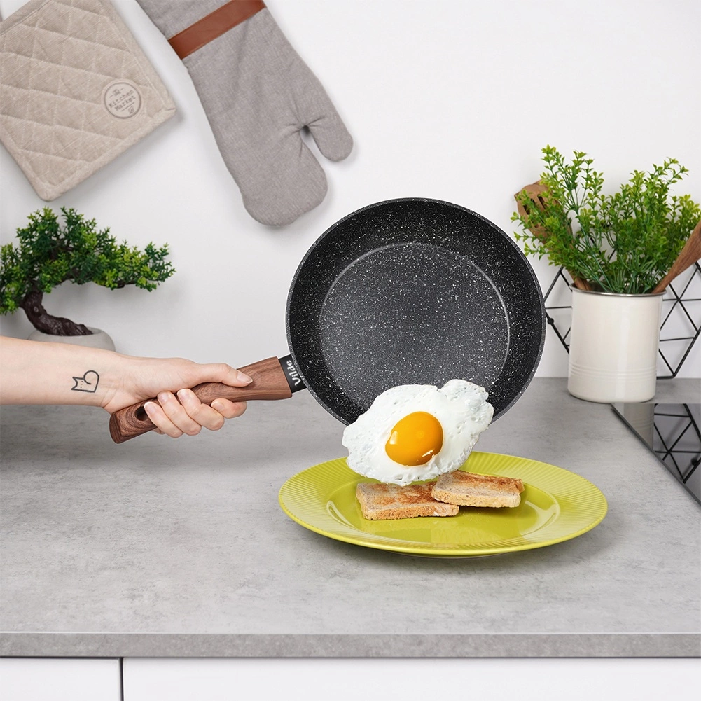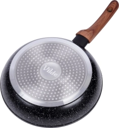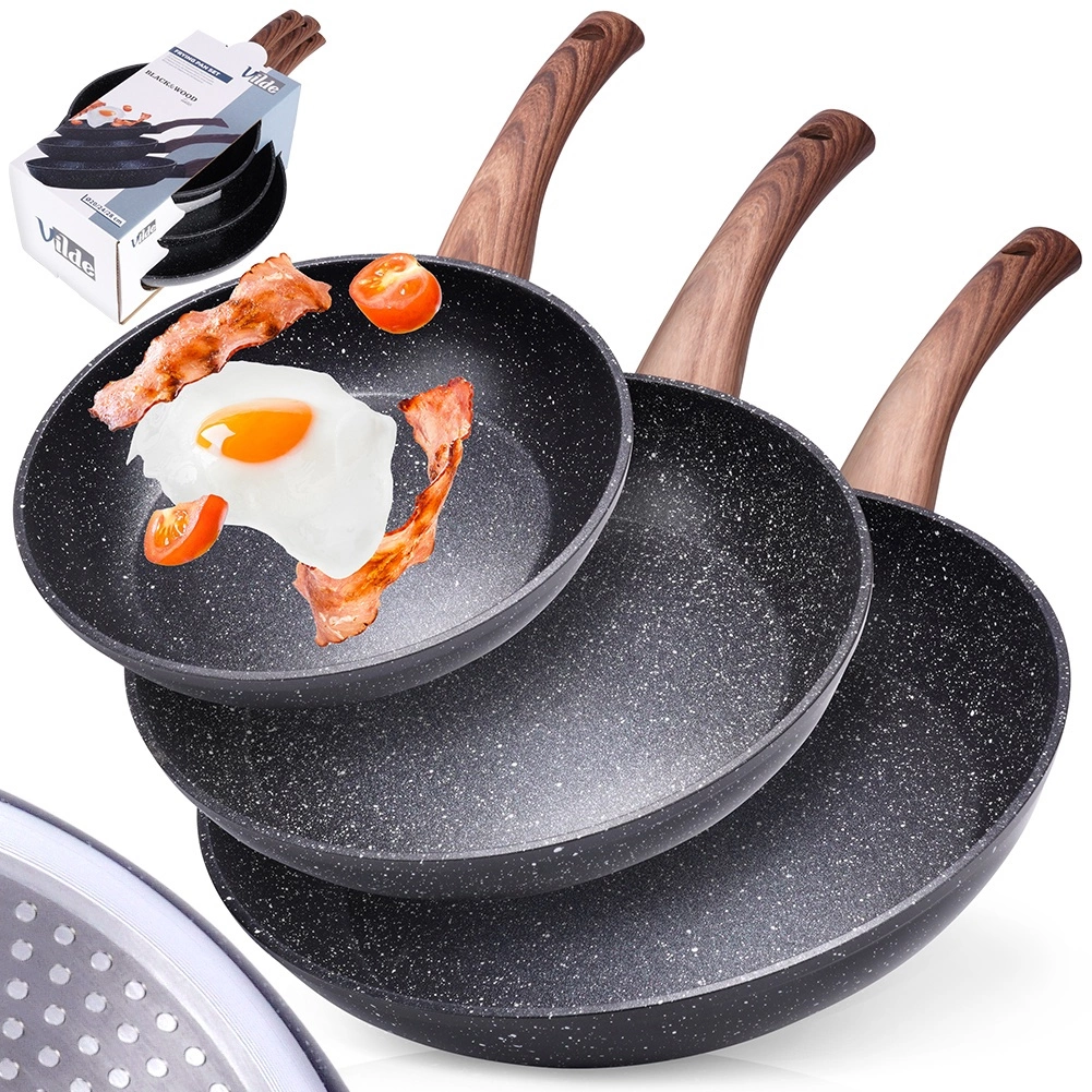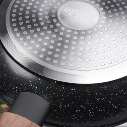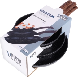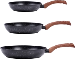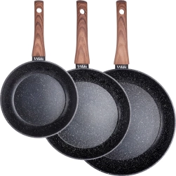 Stylová sada tří pánví v rozměrech 20, 24 a 28 cm s odolnou granitovou nepřilnavou povrchovou úpravou, rovnoměrným rozvodem tepla a ergonomickými rukojeťmi s dekorem dřeva. Vhodné pro všechny typy sporáků včetně indukce, snadno se čistí a lze je mýt v myčce. Ideální pro zdravé vaření s minimem tuku a každodenní smažení i dušení.