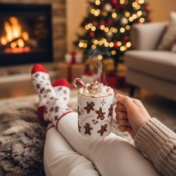 Hrnek na horké nápoje a měkké ponožky s motivem perníčků vytvoří dokonalé duo pro večery u filmu i odpočinek u krbu.