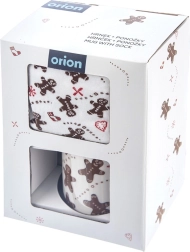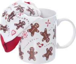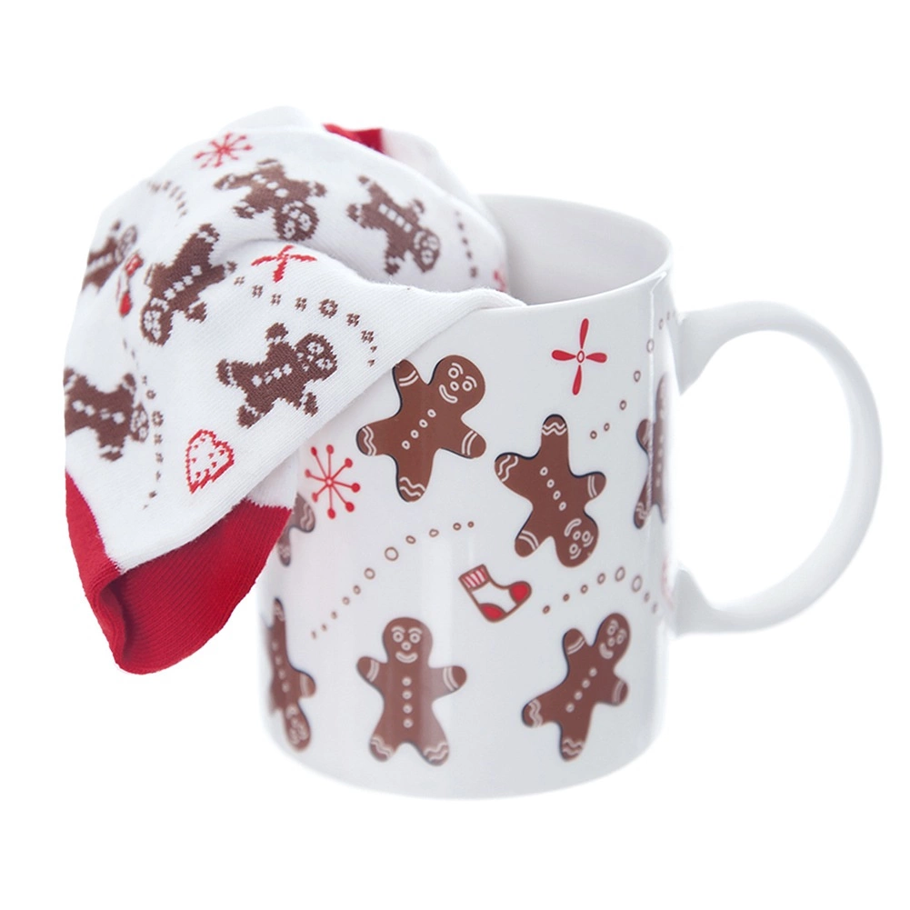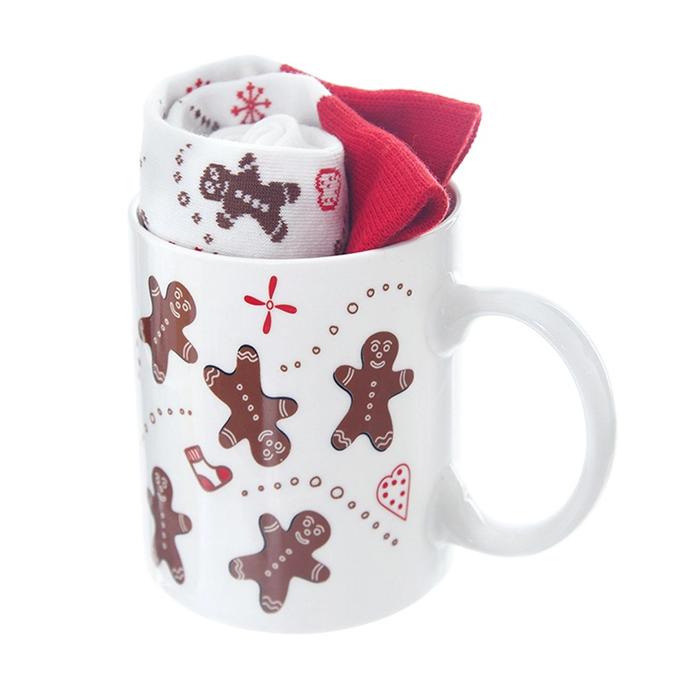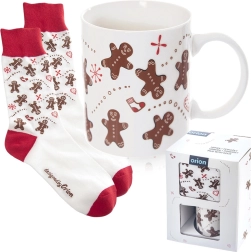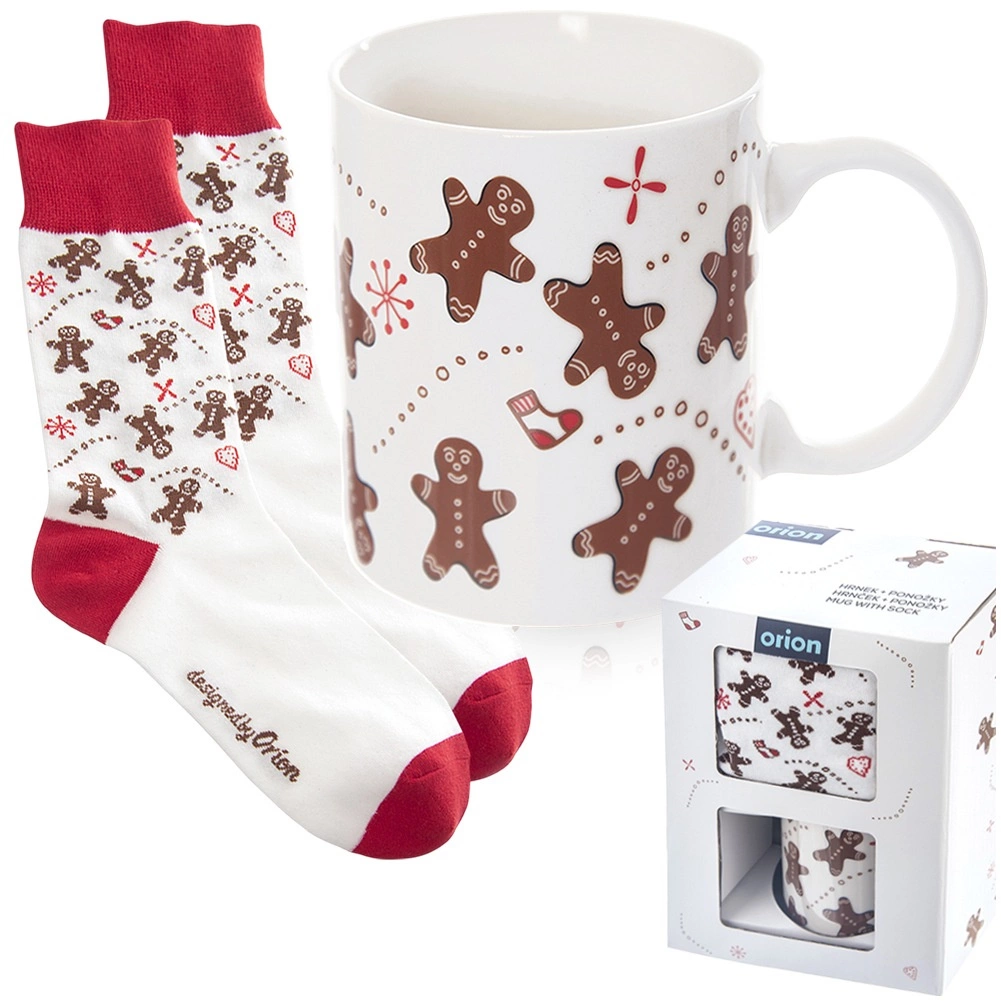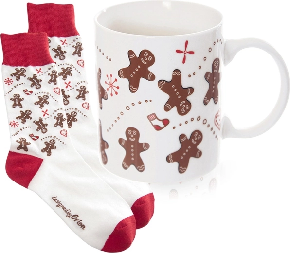 Stylový dárkový set s motivem perníčků: keramický hrnek o objemu 350 ml a měkké ponožky (vel. 38–40). Praktický i dekorativní, ideální na zimní večery u kávy či kakaa. Hrnek má klasické ucho, je vhodný do mikrovlnky, ponožky lze prát na 30 °C.