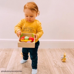 V této krabičce najdete různorodé dřevěné ovoce, jako jsou banány, jablka, jahody nebo hrušky. Pro děti je to skvělá hračka, která je nejen baví, ale zároveň je také vzdělává o významu zdravé a vyvážené stravy. Hra je navržena pro rozvíjení jemné motoriky a při hře se děti také učí, odkud pochází jejich jídlo a jak se připravuje.