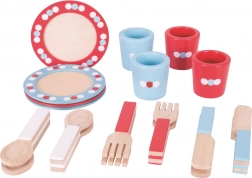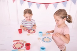 Tato barevná dřevěná jídelní sada je navržena pro začínající mladé kuchaře, kteří chtějí nachystat vlastní večeře a uspořádat čajové dýchánky. Skvělý doplněk každé dřevěné kuchyňky na hraní, sada obsahuje: