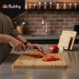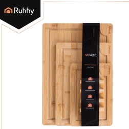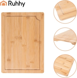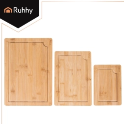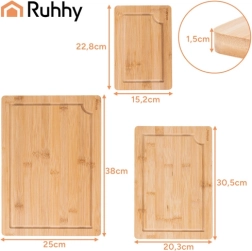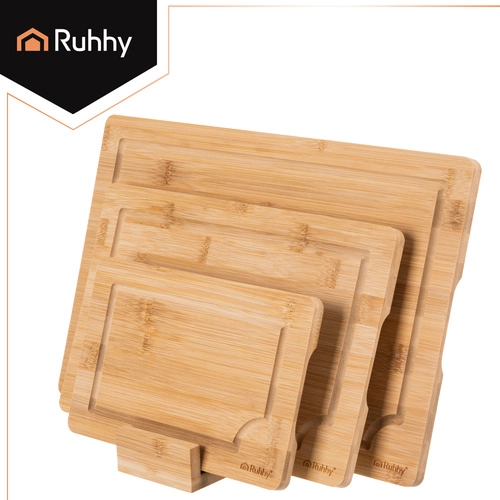 Praktická sada tří bambusových desek RUHHY v různých velikostech s pevnym stojanem pro přehledné ukládání. Přírodní bambus je odolný a hygienický, šetrný k ostří nožů a rychle schne. Integrované drážky na odvod šťávy pomáhají udržet pořádek při krájení masa, zeleniny i ovoce. Ideální do každé kuchyně pro krojení i servírování.