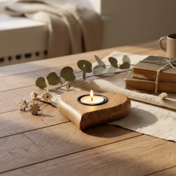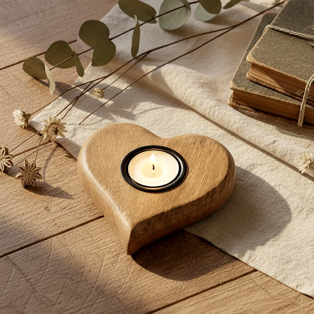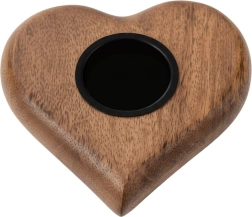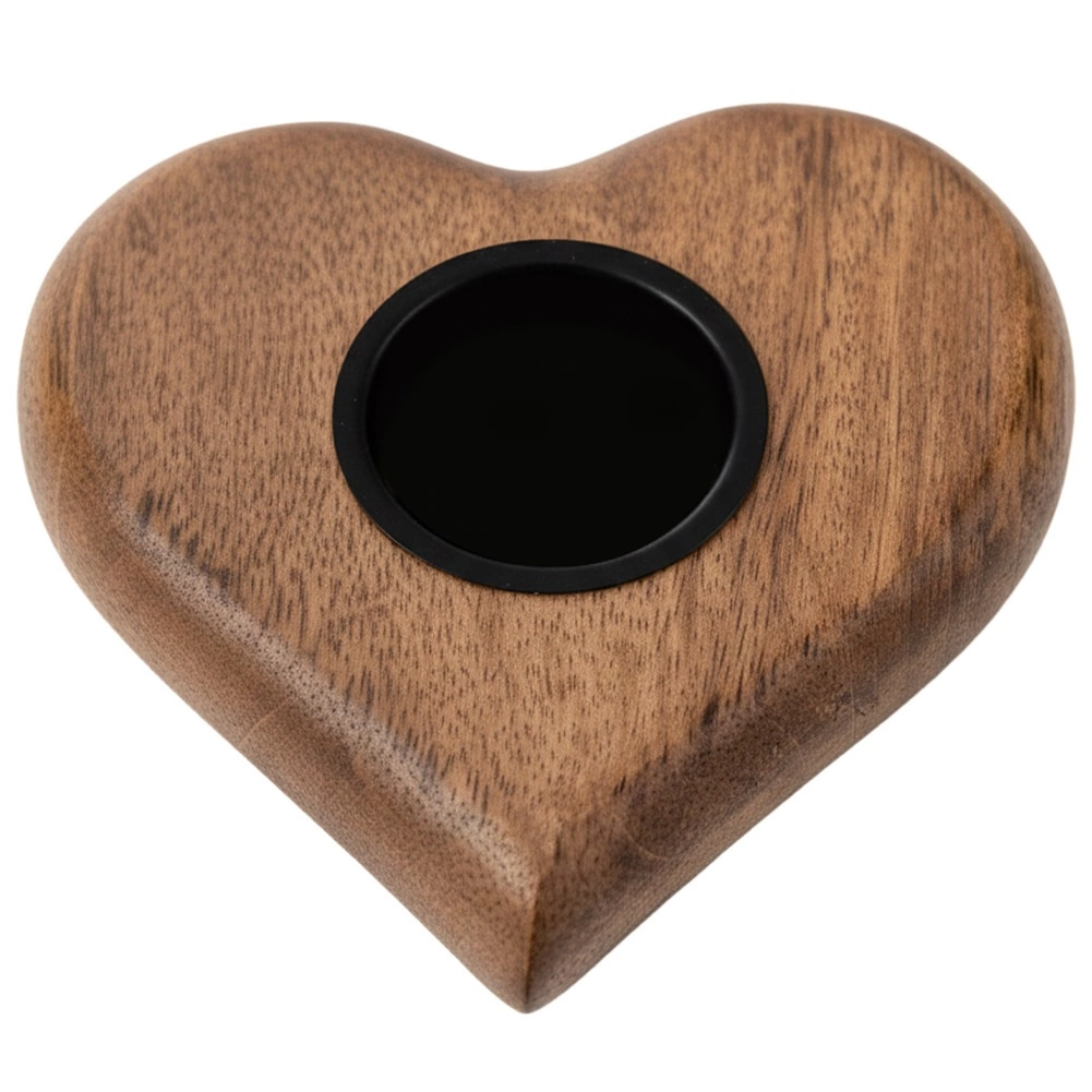 Elegantní dřevěný svícen z mangového dřeva v romantickém tvaru srdce vytvoří útulnou atmosféru v obýváku, ložnici i koupelně. Přírodní kresba dřeva a černá kovová vložka tvoří nadčasovou kombinaci, která se hodí do skandinávských, rustikálních i moderních interiérů.