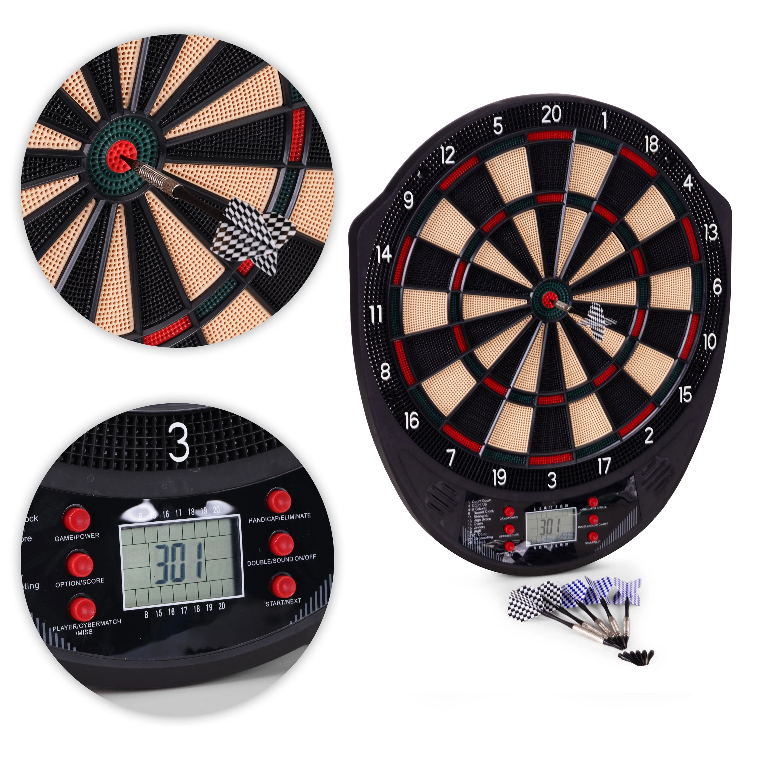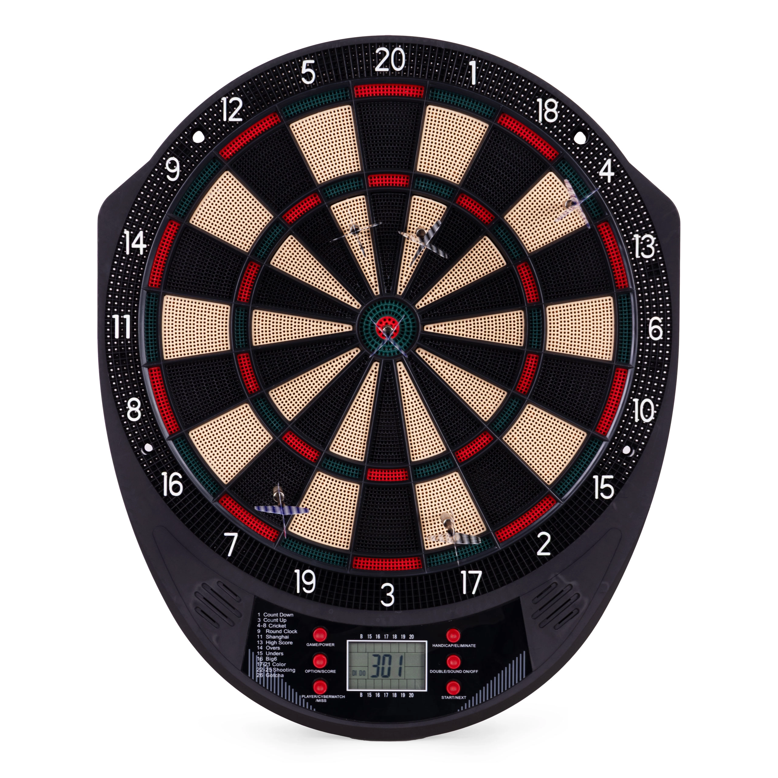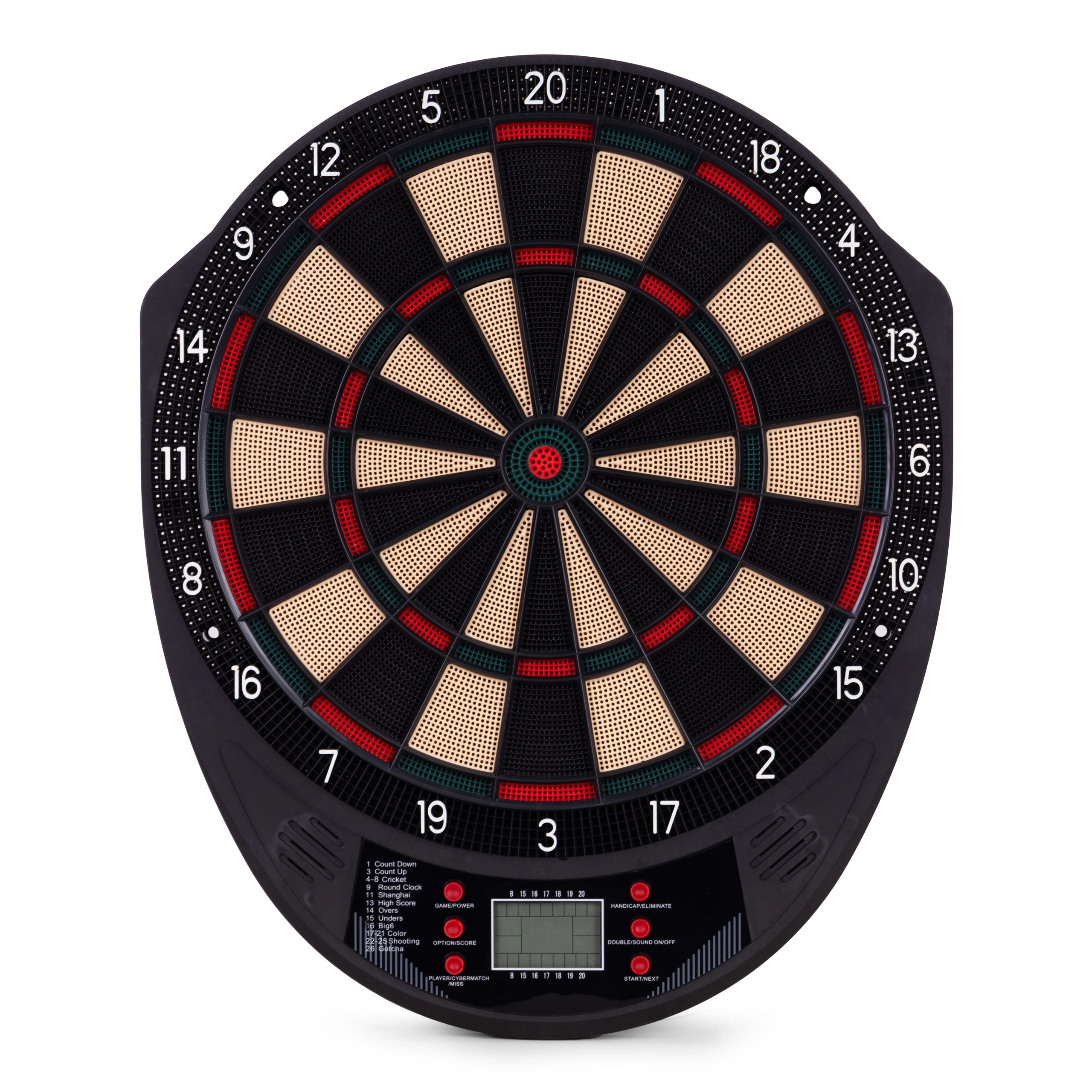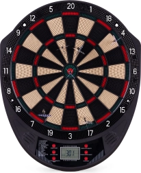 Elektronický terč na šipky o průměru 41 cm nabízí 26 her a 185 variant, LCD displej se zvukovými signály a hru až pro 8 hráčů. Díky režimu Cybermatch si zahrajete proti počítači, funkce Handicap vyrovná dovednosti a v balení najdete 6 bezpečných soft-tip šipek i montážní příslušenství.