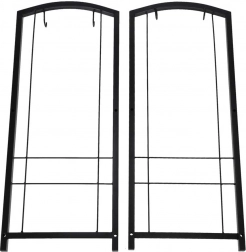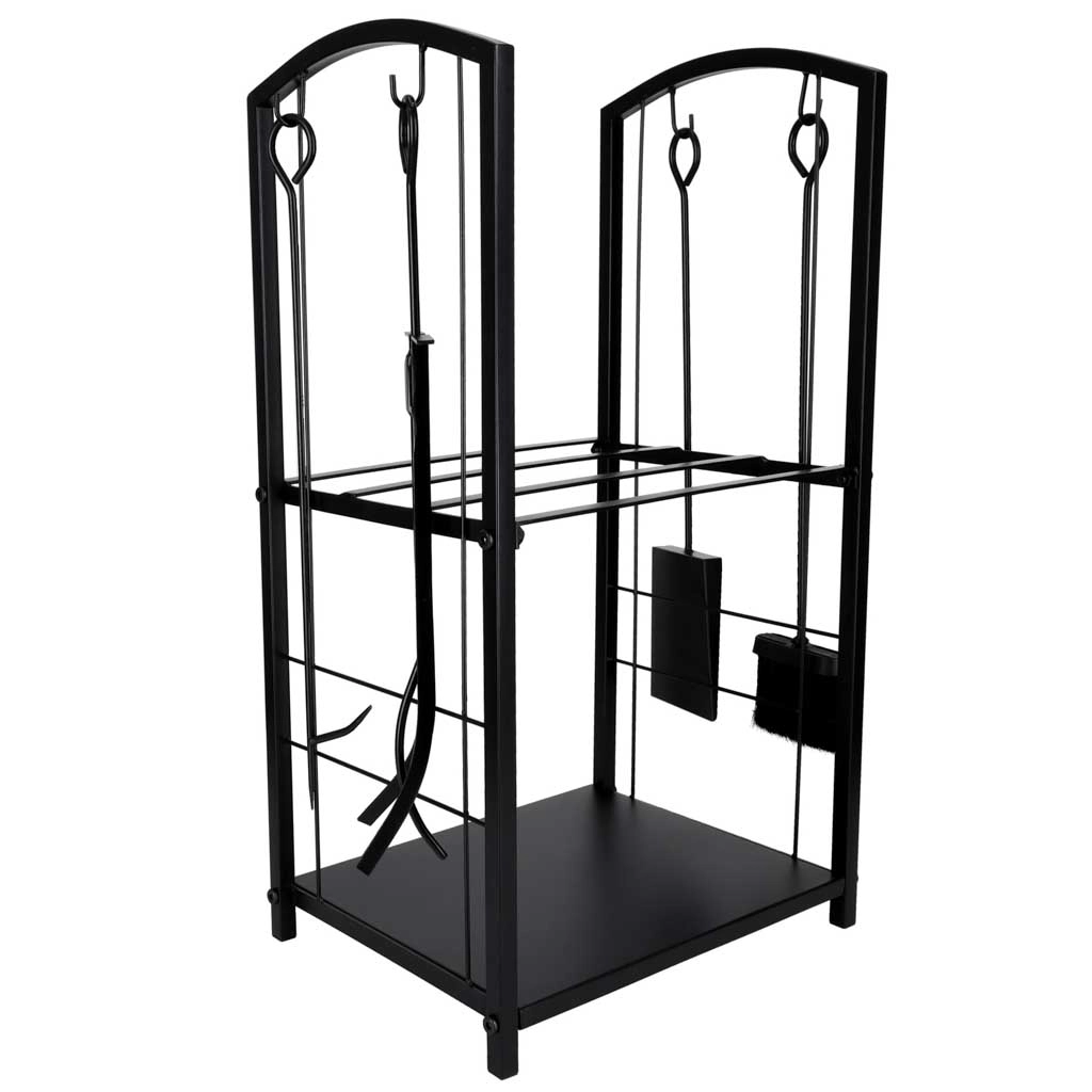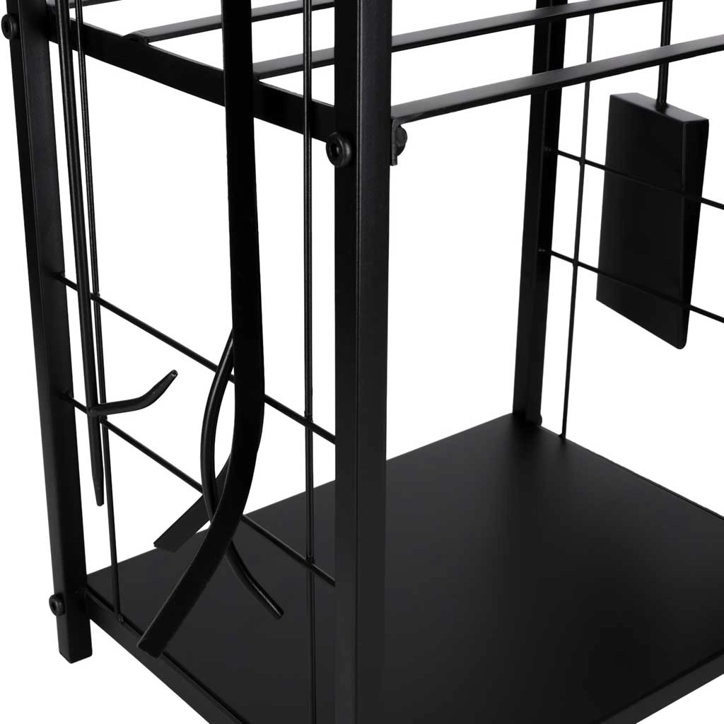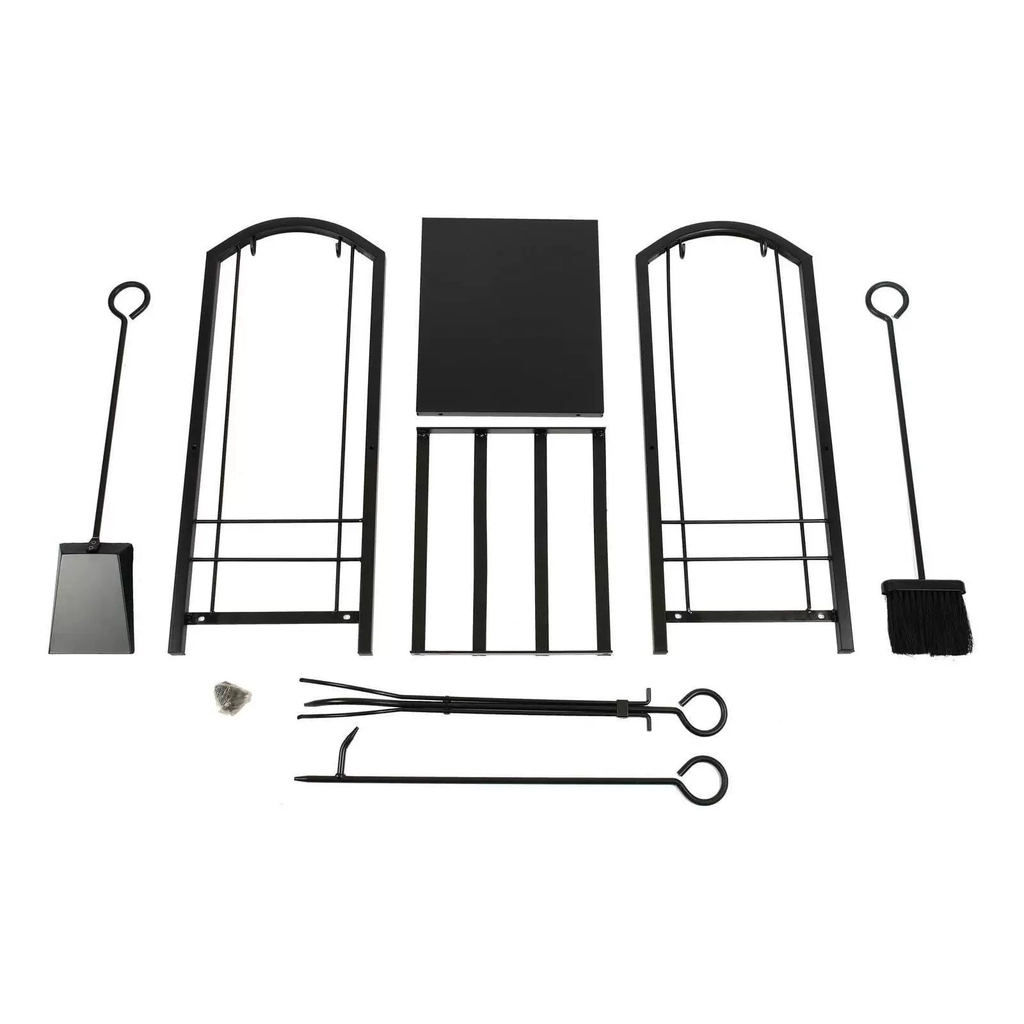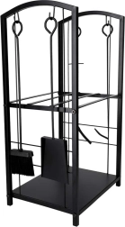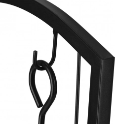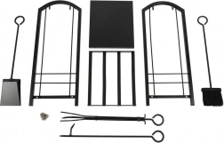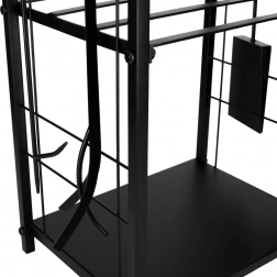 Na bočních háčcích visí kompletní krbové nářadí – pohrabáč, kleště, lopatka a kartáč – takže obsluha ohniště i úklid popela jsou rychlé a pohodlné. Otevřená konstrukce s obloukovými boky působí lehkým a elegantním dojmem a hodí se do moderních i rustikálních interiérů.
