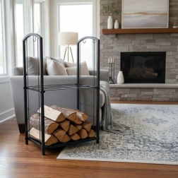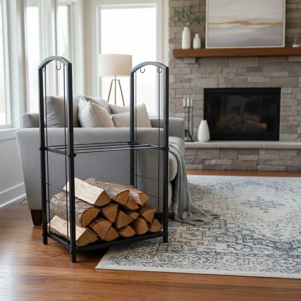 Tento kompaktní stojan promění skladování palivového dřeva v designový prvek interiéru. Robustní rám z kujného železa s práškovým lakem je odolný vůči poškrábání a dobře snáší každodenní používání. Dolní plná police chrání podlahu před nečistotami, horní větraná plocha udržuje polena v suchu a přehledně uložená.