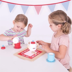Hra na čajový dýchánek rozvíjí komunikaci, spolupráci a fantazii. Děti procvičují úchop, přesnost a koordinaci pohybů, zatímco si tvoří vlastní příběhy a rituály. Elegantní puntíkový design v červené, modré a bílé barvě oživí každý dětský koutek.