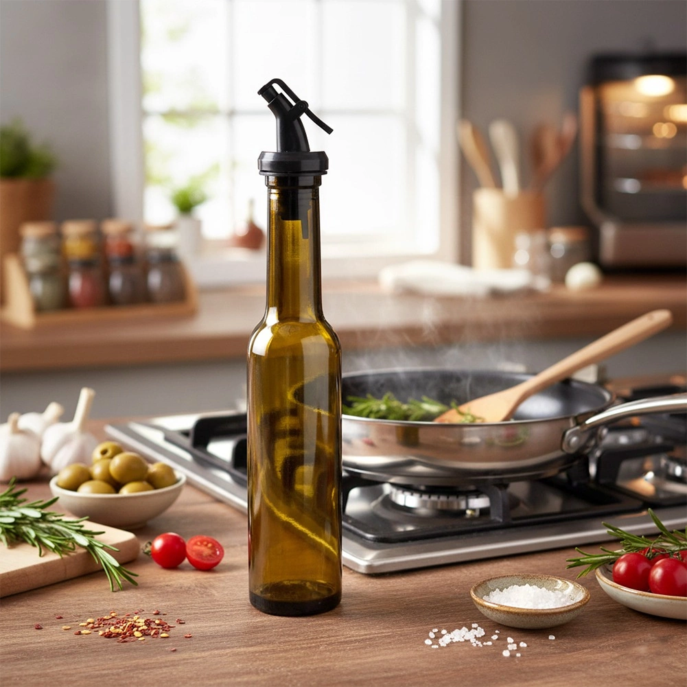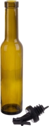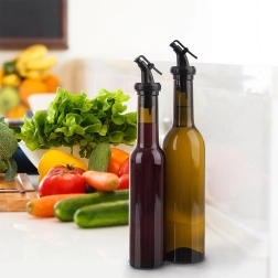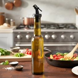 Skleněná láhev na olej, ocet, aromatické oleje, omáčky i domácí dresinky. Uzavíratelný nalévací uzávěr zajišťuje plynulý tok bez rozlití a pomáhá přesně dávkovat. Tónované sklo chrání obsah před sluncem a prodlužuje čerstvost.