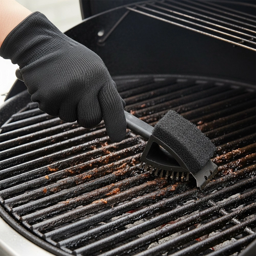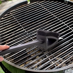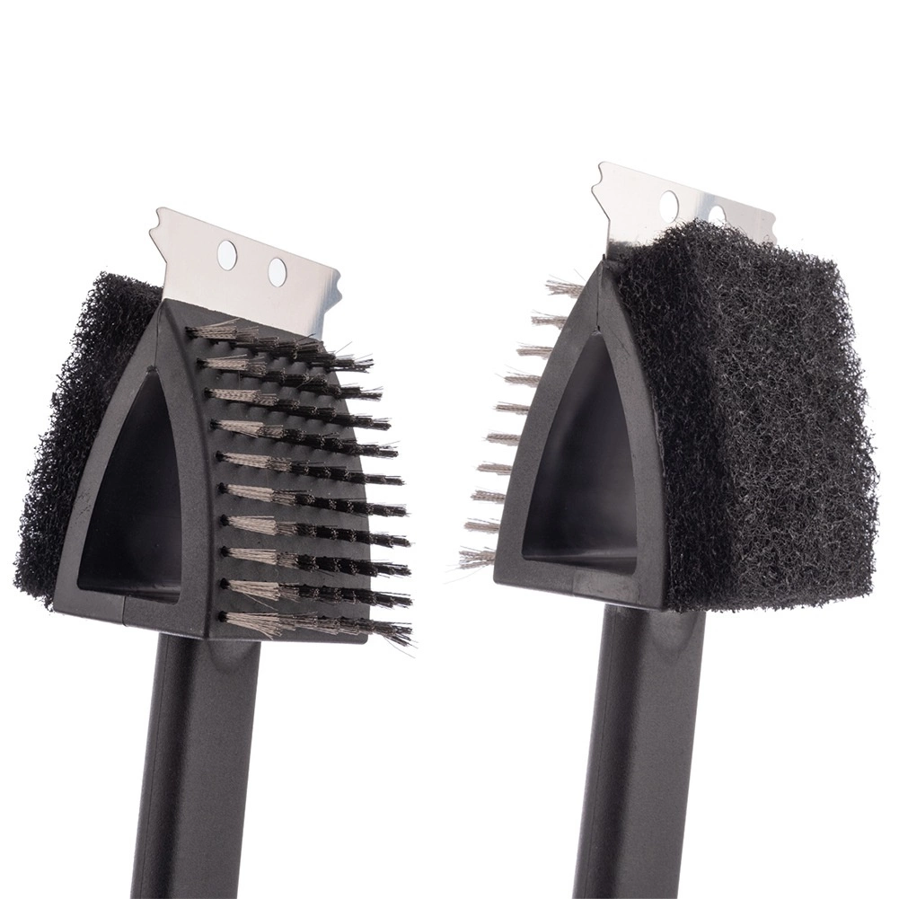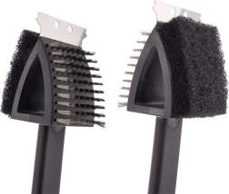 Praktická a odolná čisticí sada 3v1 výrazně urychlí údržbu grilu. Jediným nástrojem bezpečně oškrábete připálené zbytky, vykartáčujete rošt a finálně jej dočistíte abrazivní houbičkou. Díky dlouhé rukojeti 38 cm zůstane vaše ruka dál od horka a čištění je pohodlné i u větších grilů.