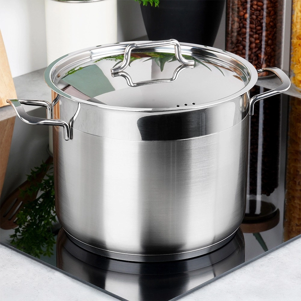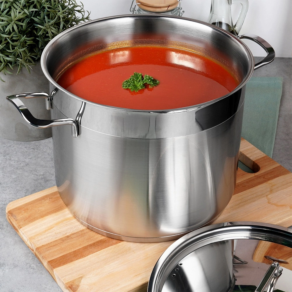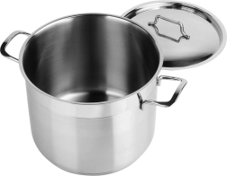 Prémiový nerezový hrnec s poklicí o objemu 6,5 l je ideální pro každodenní vaření i dušení. Díky vícevrstvému akutermickému dnu skvěle akumuluje a rovnoměrně rozvádí teplo, je vhodný na všechny typy sporáků včetně indukce a umožňuje energeticky úsporné vaření s minimem tuku. Kvalitní nerez 18/10, masivní stěny, pohodlné úchyty a snadné čištění včetně myčky dělají z hrnce spolehlivého pomocníka do každé kuchyně.