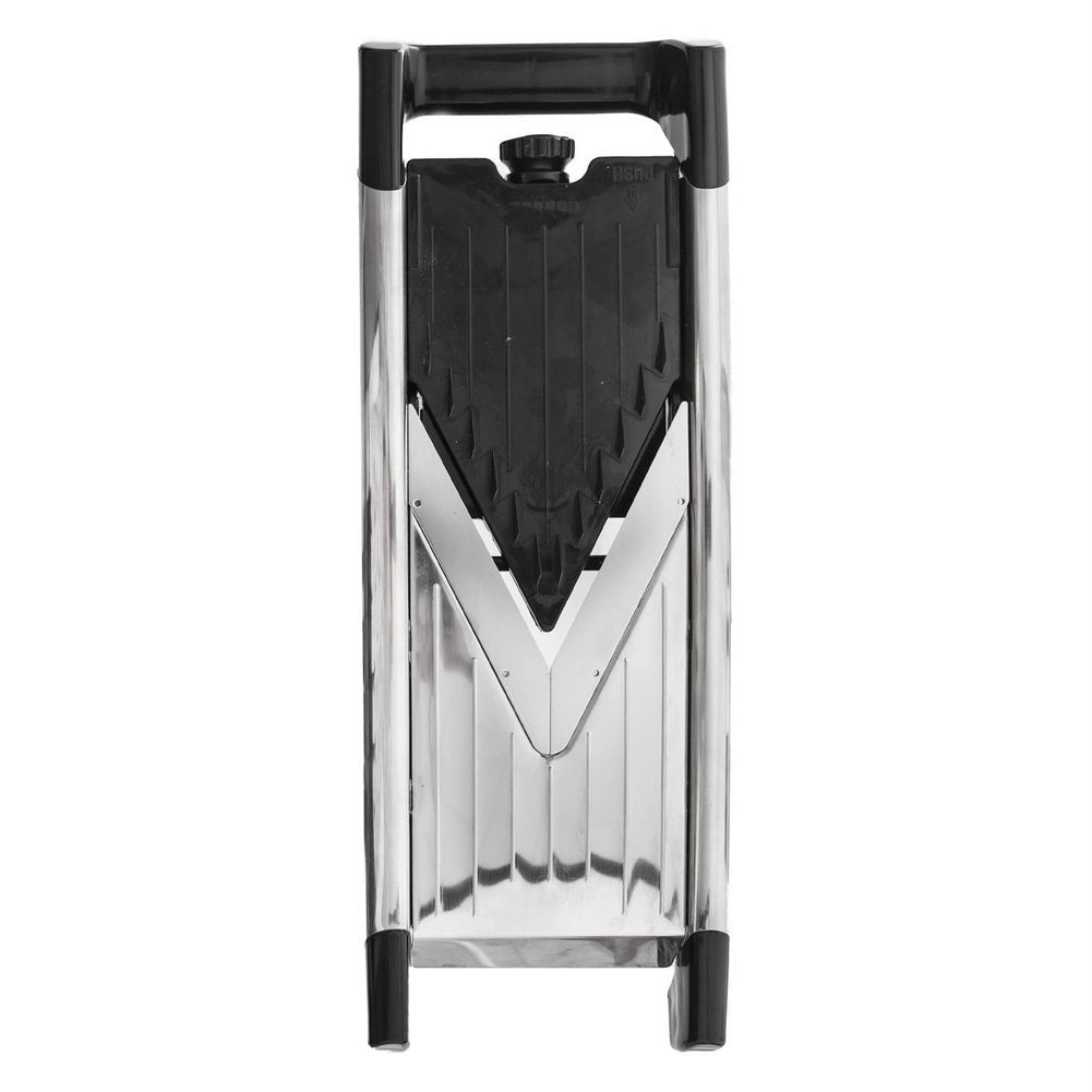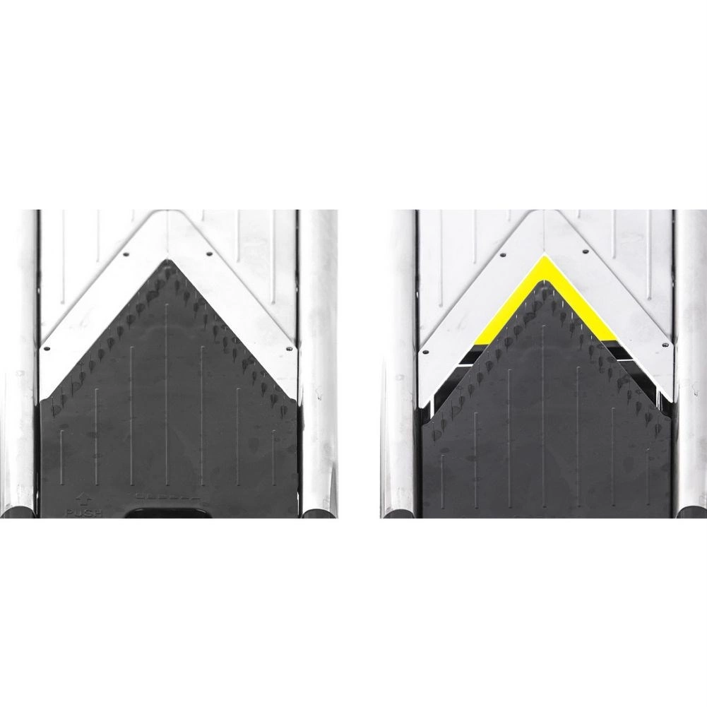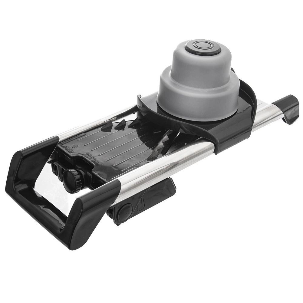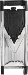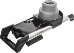 Ochranný držák chrání prsty a sklopné protiskluzové nožky dodají mandolíně stabilní sklon pro rychlou a bezpečnou práci.