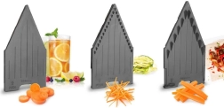Sada zahrnuje tři vyměnitelné vložky s různým profilem pro tenké plátkování i krájení na proužky – ideální na saláty, zeleninové nudle i hranolky.