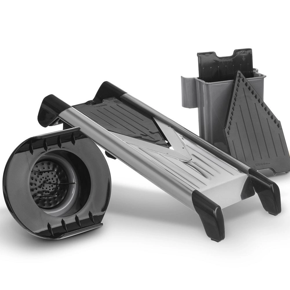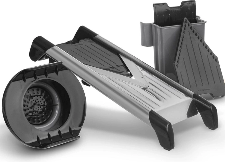 Bezpečnost zajišťuje ochranný držák/pusher, který chrání prsty, a protiskluzové sklopné nožky pro stabilní sklon. Výměnné vložky uložíte do praktického boxu, takže jsou vždy po ruce a zároveň chráněné. Celé tělo je z odolného plastu v šedé a černé barvě a údržbu usnadňuje možnost mytí v myčce.