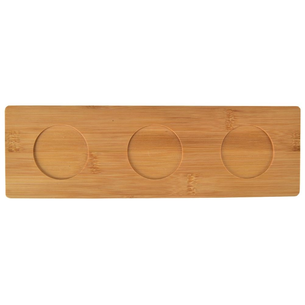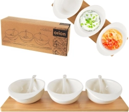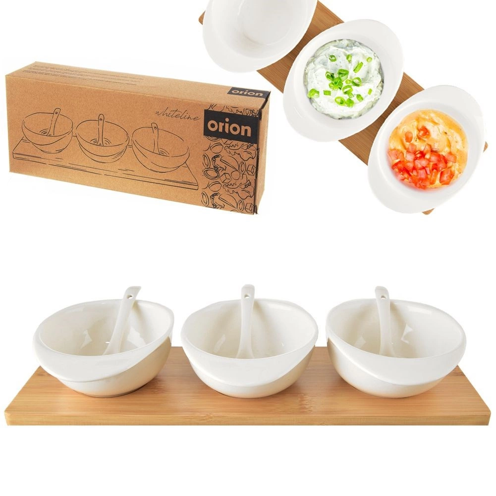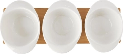Elegantní sada tří bílých porcelánových misek se lžičkami na pevném bambusovém tácu pro stylové servírování. Ideální na dipů, omáček, předsídel a pochutin. Kvalitní porcelán a odolný bambus zajistí dlouhou životnost, vyjímatelné misky se snadno přenášejí i myjí. Vhodné do myčky a mikrovlnky.