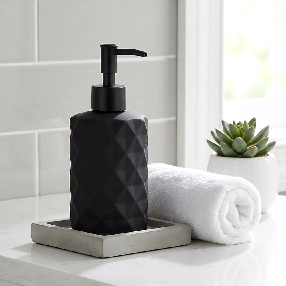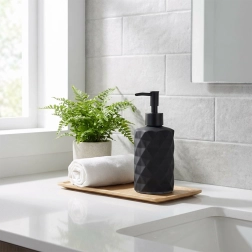 Matně černé sklo s geometrickou strukturou dodá vaší koupelně či kuchyni prémiový vzhled a zároveň usnadní držení bez klouzání.
