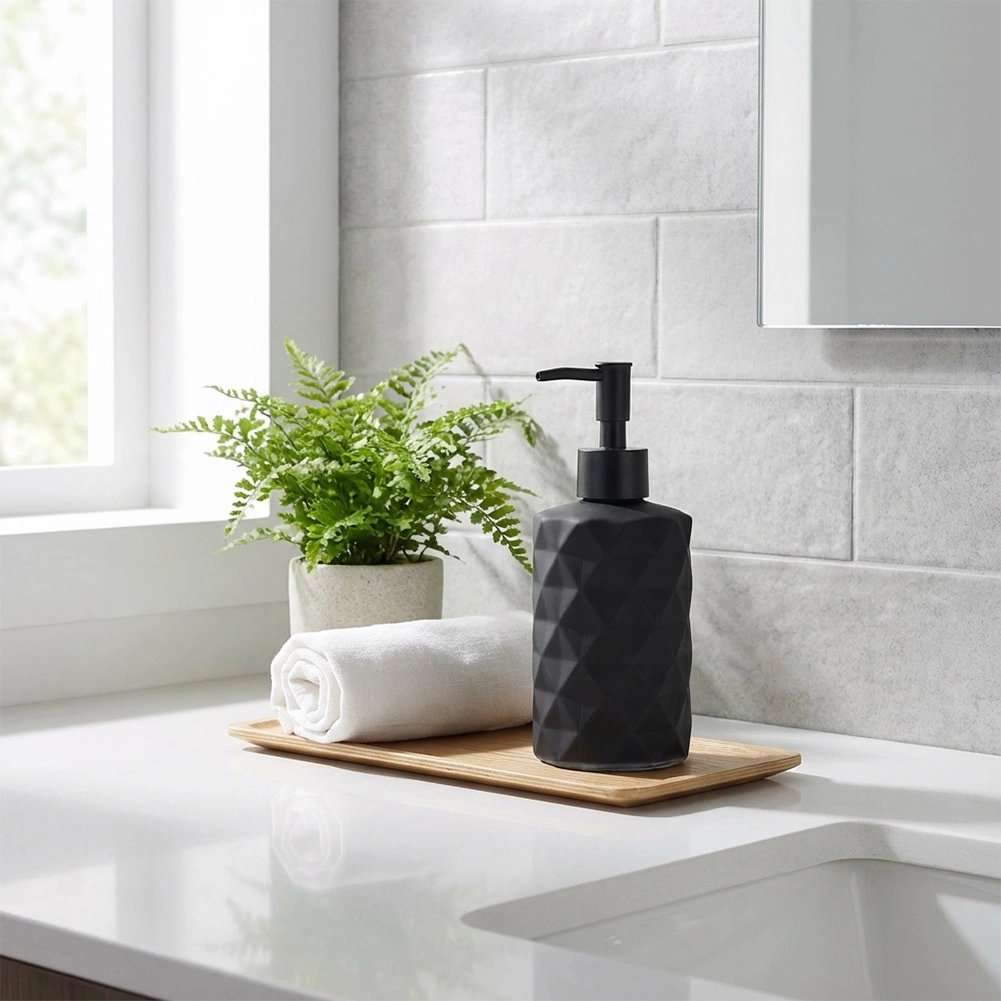 Skleněný dávkovač mýdla v černé matné barvě kombinuje estetiku a funkčnost. Průsvitné dekorativní sklo umožňuje kontrolu množství náplně, zatímco odolná pumpička zajišťuje plynulé dávkování. Ideální pro tekuté mýdlo, dezinfekci nebo prostředek na mytí nádobí.