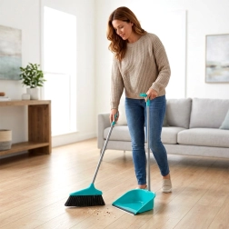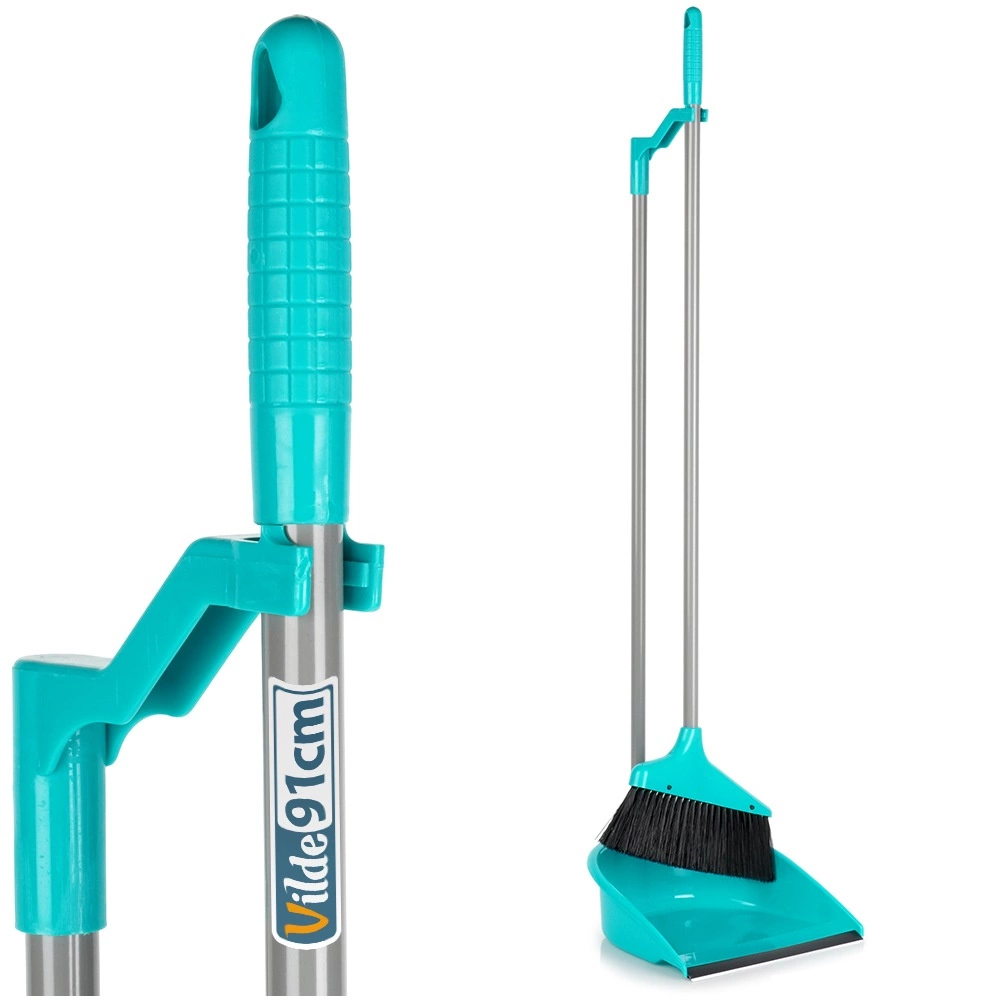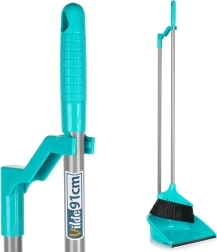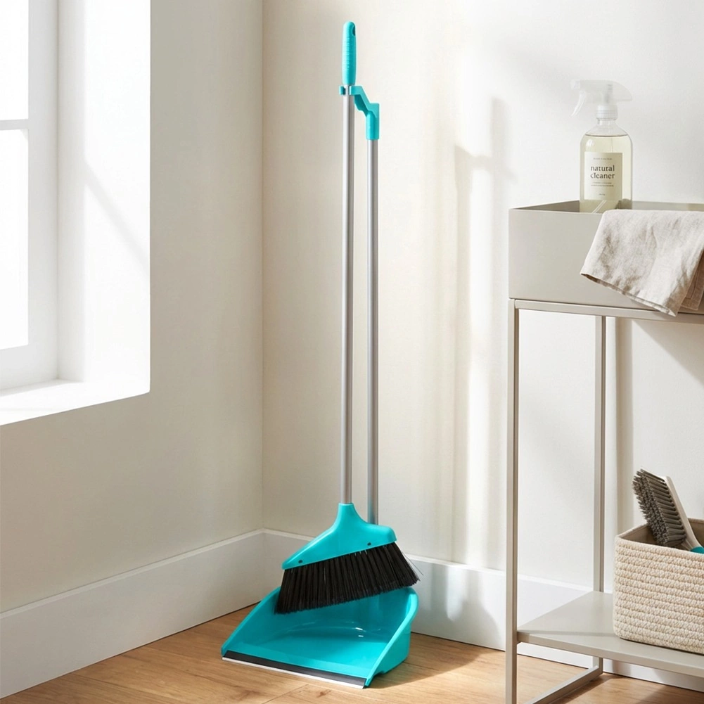 Tento smeták s lopatkou v elegantní tyrkysové barvě přináší pohodlný úklid v pozici ve stoje. Dlouhé rukojeti zajišťují přirozené držení těla a minimalizují namáhání zad, zatímco gumový lem lopatky (šířka 2 cm) perfektně přilne k podlaze a zachytí i drobný prach bez zanechání zbytků.