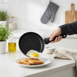 Kompaktní granitová pánev 20 cm z odlévaného hliníku pro každodenní vaření. Nabízí nepřilnavý povrch pro zdravější přípravu s minimem tuku, rychlé a rovnoměrné rozložení tepla a ergonomickou, neohřívající se rukojeť s otvorem na zavěšení. Vhodná na všechny typy sporáků včetně indukce a lze ji mýt v myčce nádobí.