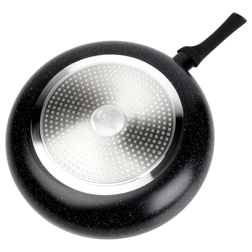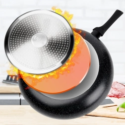 Masivní hliníkové tělo a vícevrstvá konstrukce rozvádí teplo po celé ploše pánve pro úsporné a rovnoměrné smažení bez horkých míst.