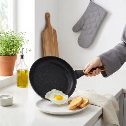 Objevte odolnou pánev z linie TERRUNA, která kombinuje moderní design a prvotřídní funkčnost. Nepřilnavá granitová vrstva umožňuje vařit s minimem oleje, snadno se čistí a je ideální na smažení i dušení masa, zeleniny či vajec.