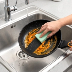 Povrch se stone-efektem zabraňuje připékání a umožňuje vařit s minimem tuku, přičemž čištění je otázkou chvilky.