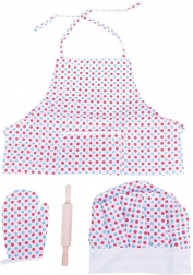 - Obsah balení: zástěra, kuchařská čepice, chňapka, dřevěný váleček, kovová vykrajovátka