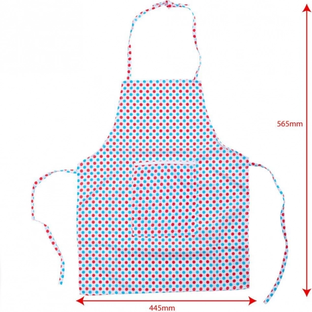 Příjemná zástěra s barevnými puntíky chrání oblečení při hře i skutečném pečení. Nastavitelná čepice na suchý zip se snadno přizpůsobí obvodu hlavy a drží pohodlně po celý den.