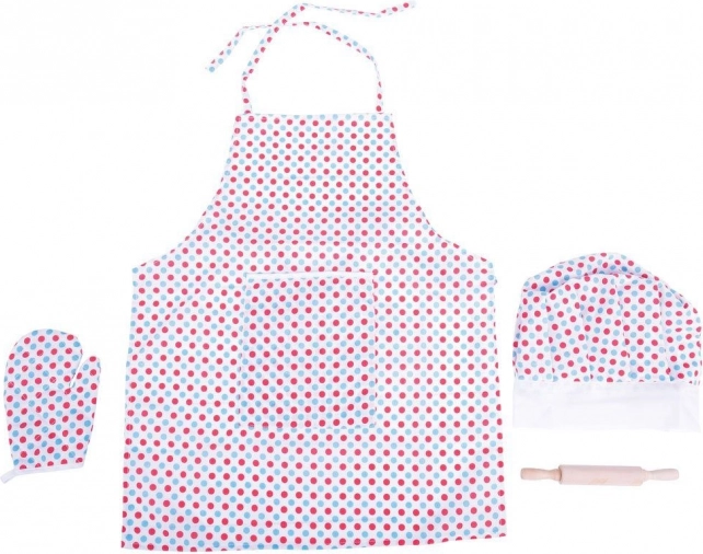 Dopřejte malým kuchařům vše, co potřebují k prvnímu pečení i zábavné hře na vaření. Lehká textilní zástěra s puntíky chrání oblečení, kuchařská čepice se díky suchému zipu snadno přizpůsobí a dřevěný váleček s kovovými vykrajovátky podnítí kreativitu a radost z tvoření.