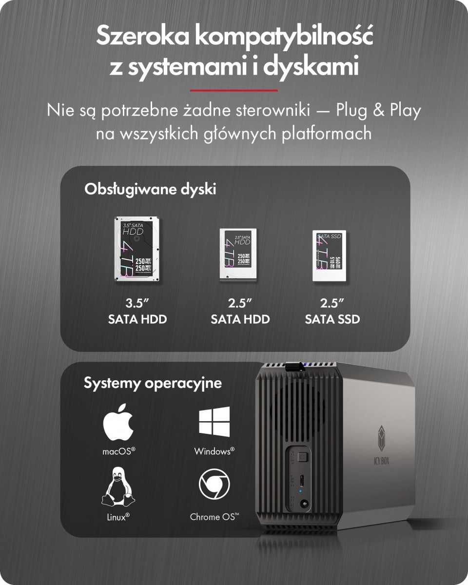 IB-RD3720-CU3 je univerzální externí RAID box pro náročné uživatele i kreativní týmy, kteří potřebují spolehlivé a rychlé úložiště. Díky podpoře dvou 2,5"/3,5" SATA disků o celkové kapacitě až 60 TB snadno zvládne zálohy, práci s videem i rozsáhlé projekty.