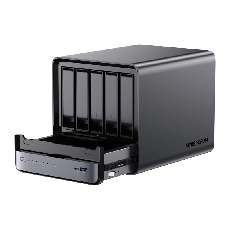 MINISFORUM NAS N5 je výkonné mini PC/NAS pro domácí i firemní použití. Díky procesoru AMD Ryzen 7 (8C/16T) a integrované grafice Radeon 780M zvládá multitasking, virtualizaci, AI/ML úlohy i 4K/8K multimédia. Úložiště až 144 TB v kombinaci pěti HDD a tří NVMe SSD, podpora RAID 0/1/5/6 a souborový systém ZFS se snapshoty zajistí rychlost i ochranu dat.