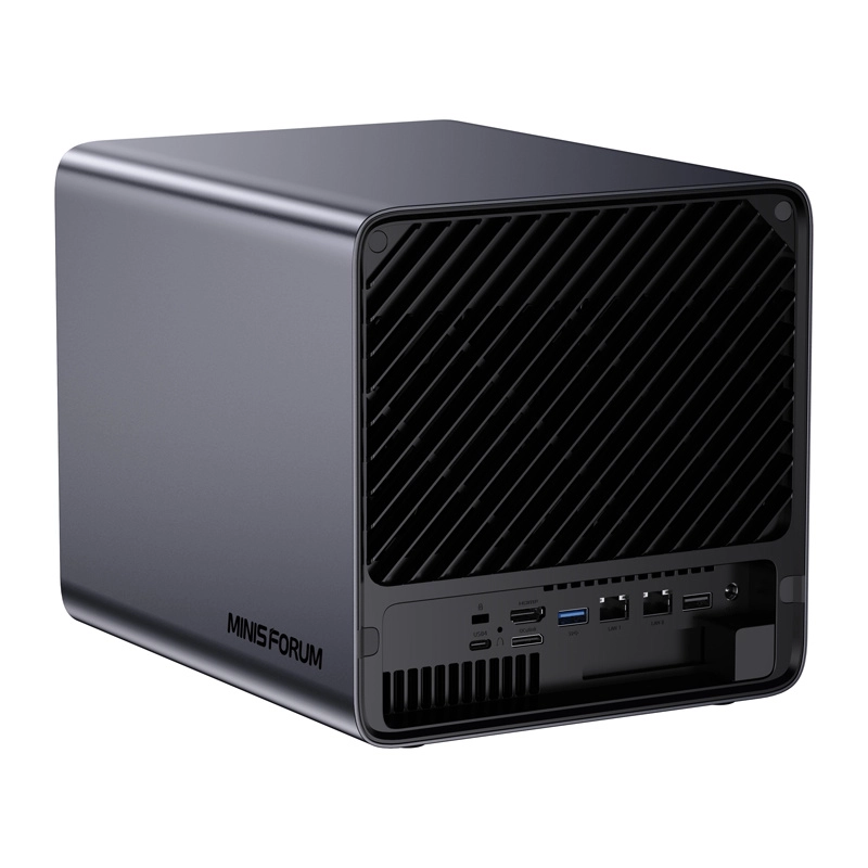 Špičková konektivita zahrnuje 10 GbE + 5 GbE, dvojici USB4, HDMI 2.1, a rozšiřitelnost přes PCIe x16 a OCuLink (eGPU). MinisCloud OS nabízí multiplatformní přístup (Windows/macOS/iOS/Android), inteligentní fotoknihovnu s AI, kompresi LZ4 a šifrované vzdálené připojení bez složité konfigurace.