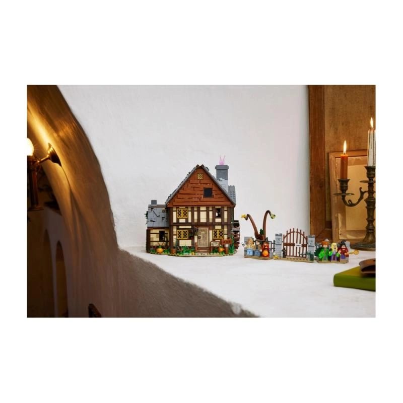 Objevte ikonickou chatku z filmu Disney Hokus pokus v podobě vysoce detailní stavebnice pro fanoušky i sběratele. Model se otevírá několika způsoby pro snadný přístup do interiéru: uvidíte muzejní obchůdek, čarodějnickou ložnici plnou netopýrů a kotlík se světelnou kostkou LEGO, která prosvítí oheň odspodu. Nechybí Kniha kouzel, postranní místnost pro uvěznění Dani a funkční vodní kolo s komínem, ze kterého při otáčení „stoupá“ růžový kouř.