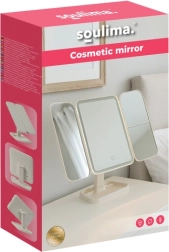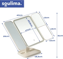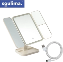 Elegantní kosmetické zrcátko SOULIMA promění vaši toaletku v malé beauty studio. Trojdílná skládací konstrukce s centrálním zrcadlem a dvěma bočními křídly nabízí více úhlů pohledu, zvětšení 2× a 3× usnadní precizní líčení. LED osvětlení s nastavitelnou teplotou 3000–7000 K zajistí přirozené barvy za jakýchkoli podmínek. Praktický dotykový ovladač, otočení až 270° a vestavěná baterie 600 mAh s nabíjením USB‑C dělají ze zrcátka stylového a funkčního pomocníka.