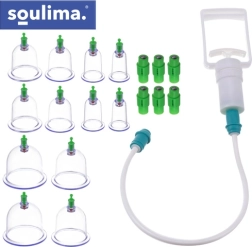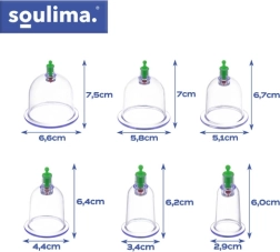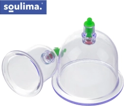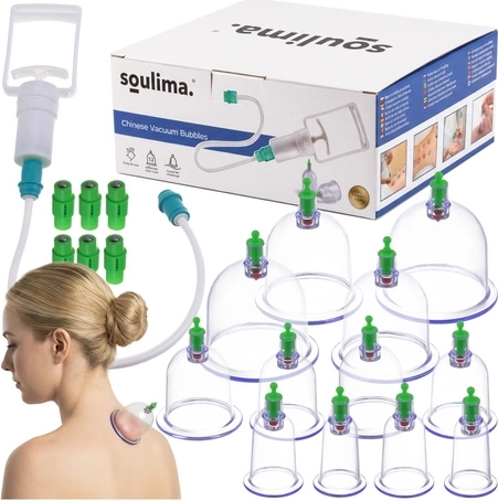 Sada vakuových baněk SOULIMA je praktickým řešením pro domácí baňkování bez plamene. Díky ruční pumpičce snadno nastavíte podtlak, což zajišťuje bezpečnější a přesnější terapii. Různé velikosti baněk umožní ošetřit větší svalové partie i menší, citlivější místa. Magnetické nástavce podporují cílenou stimulaci akupresurních bodů.