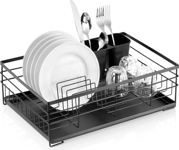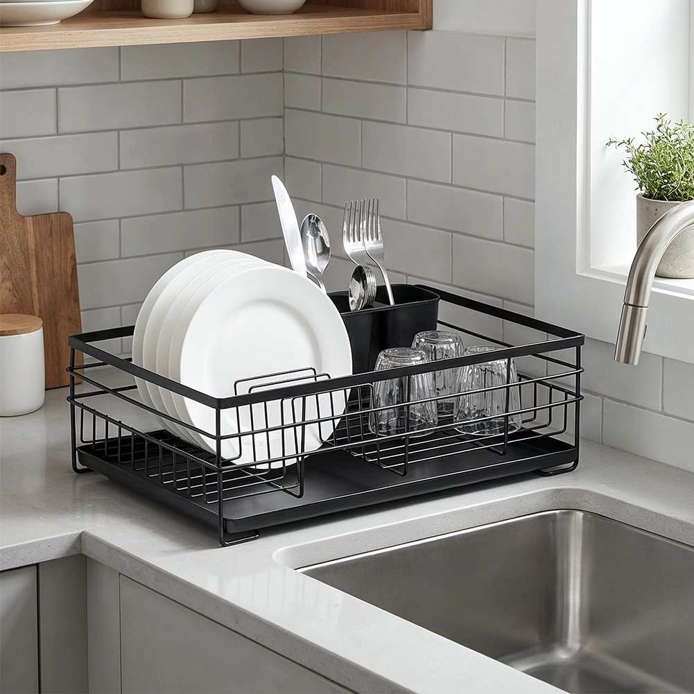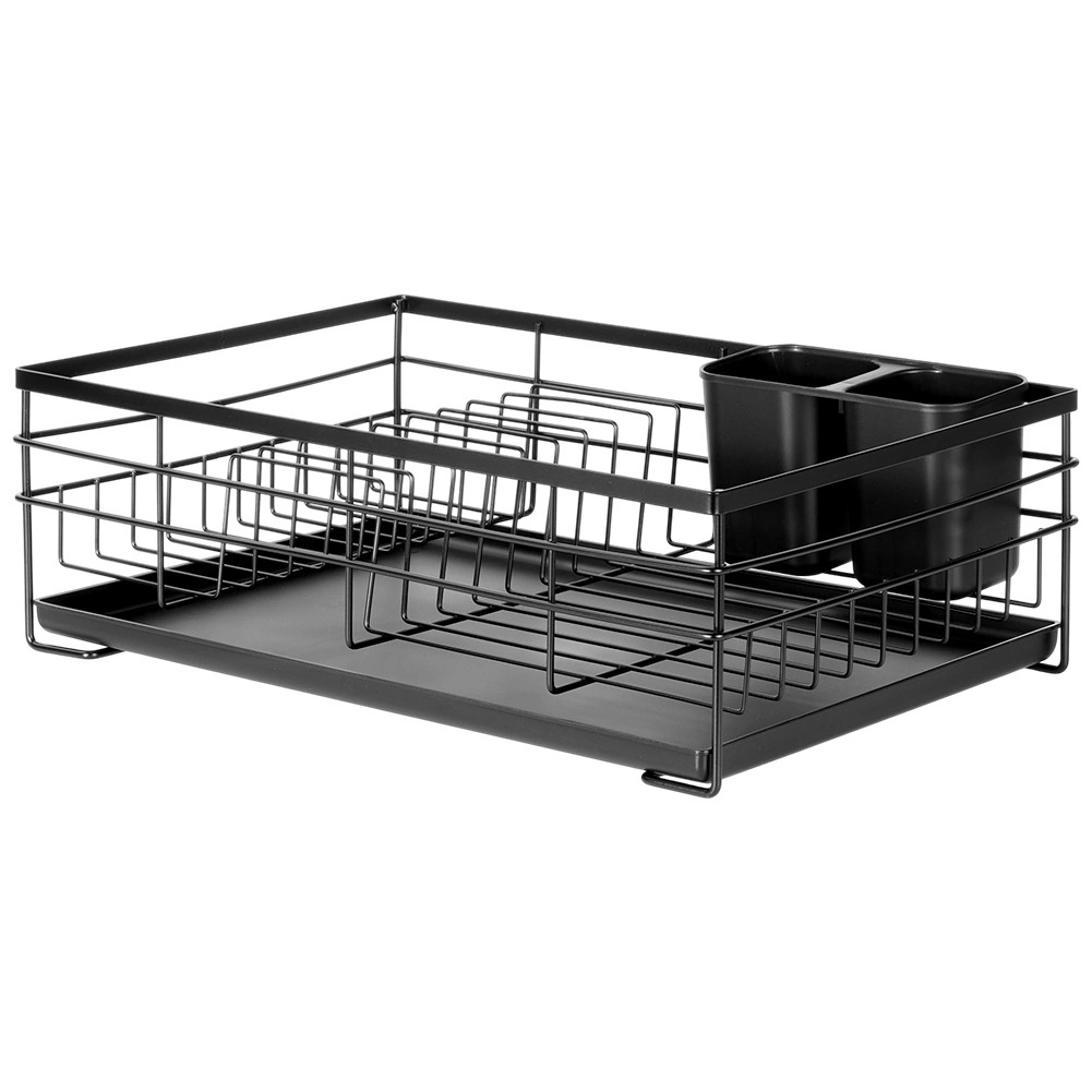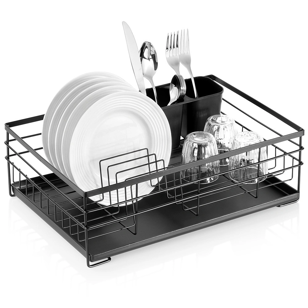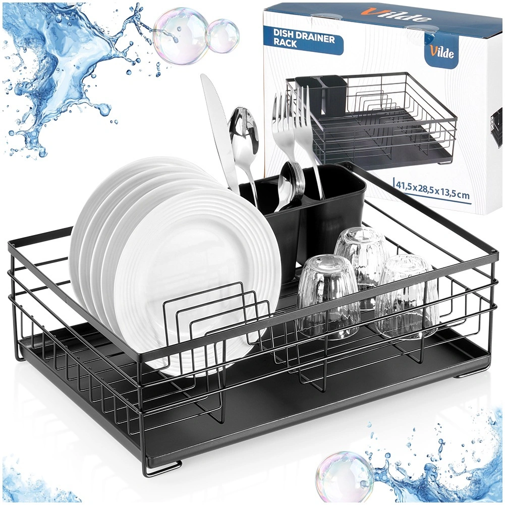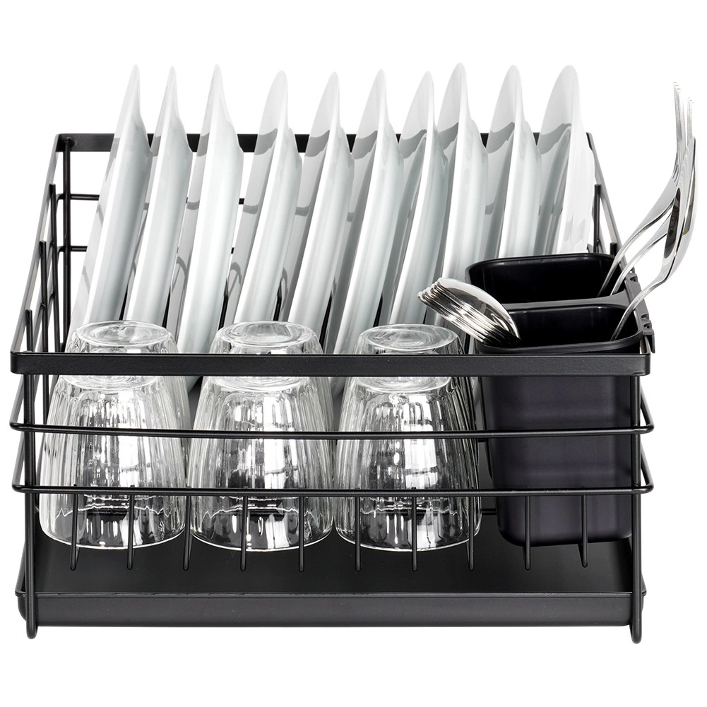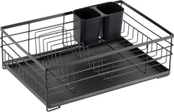 Praktický a stylový odkapávač na nádobí v černé barvě pro přehledné sušení talířů, sklenic a příborů. Nabízí velkou kapacitu, odolnou kovovou konstrukci a vyjímatelnou odkapávací tácu, která chrání kuchyňskou linku před vodou.