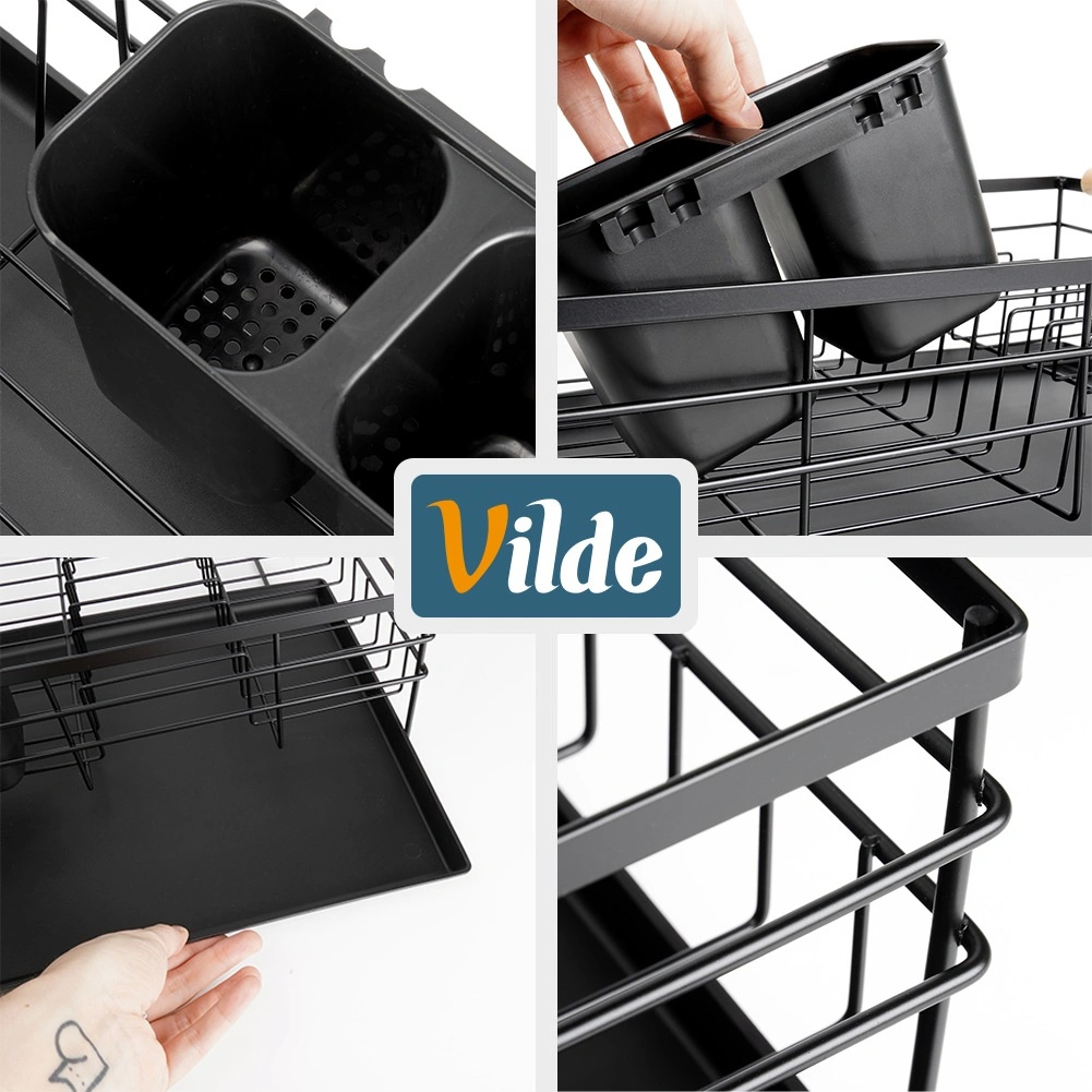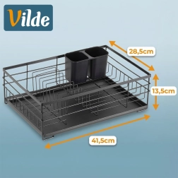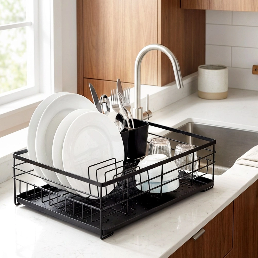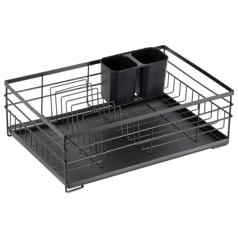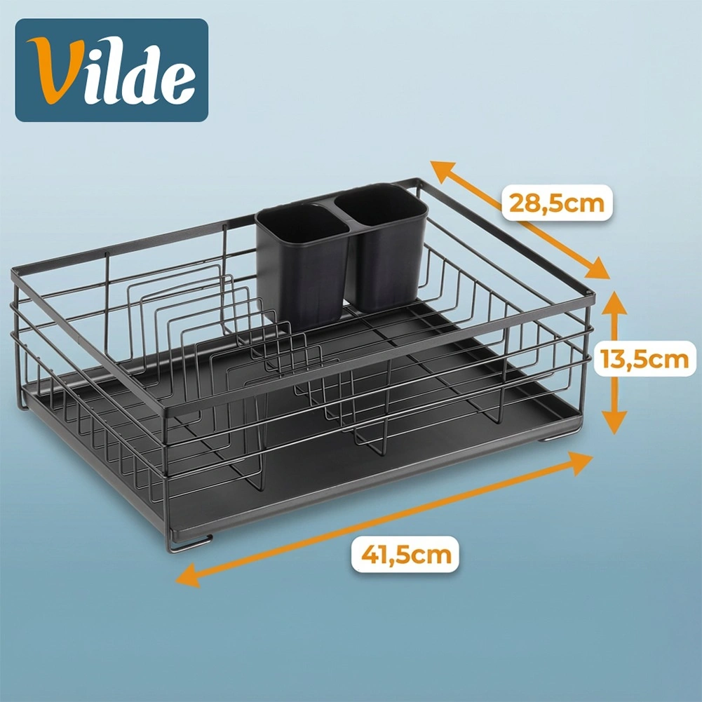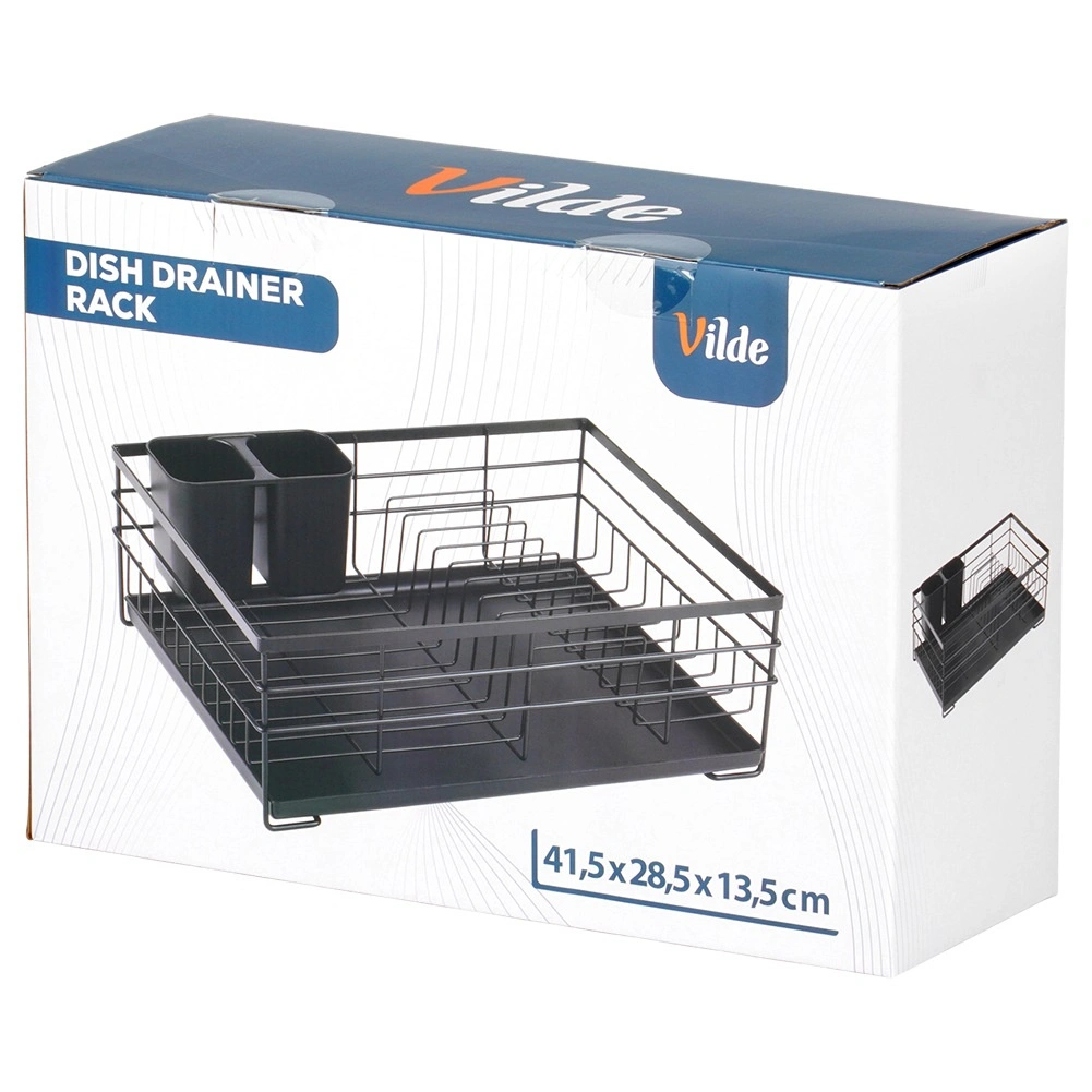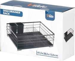 Praktický a stylový odkapávač na nádobí v černé barvě pro přehledné sušení talířů, sklenic a příborů. Nabízí velkou kapacitu, odolnou kovovou konstrukci a vyjímatelnou odkapávací tácu, která chrání kuchyňskou linku před vodou.