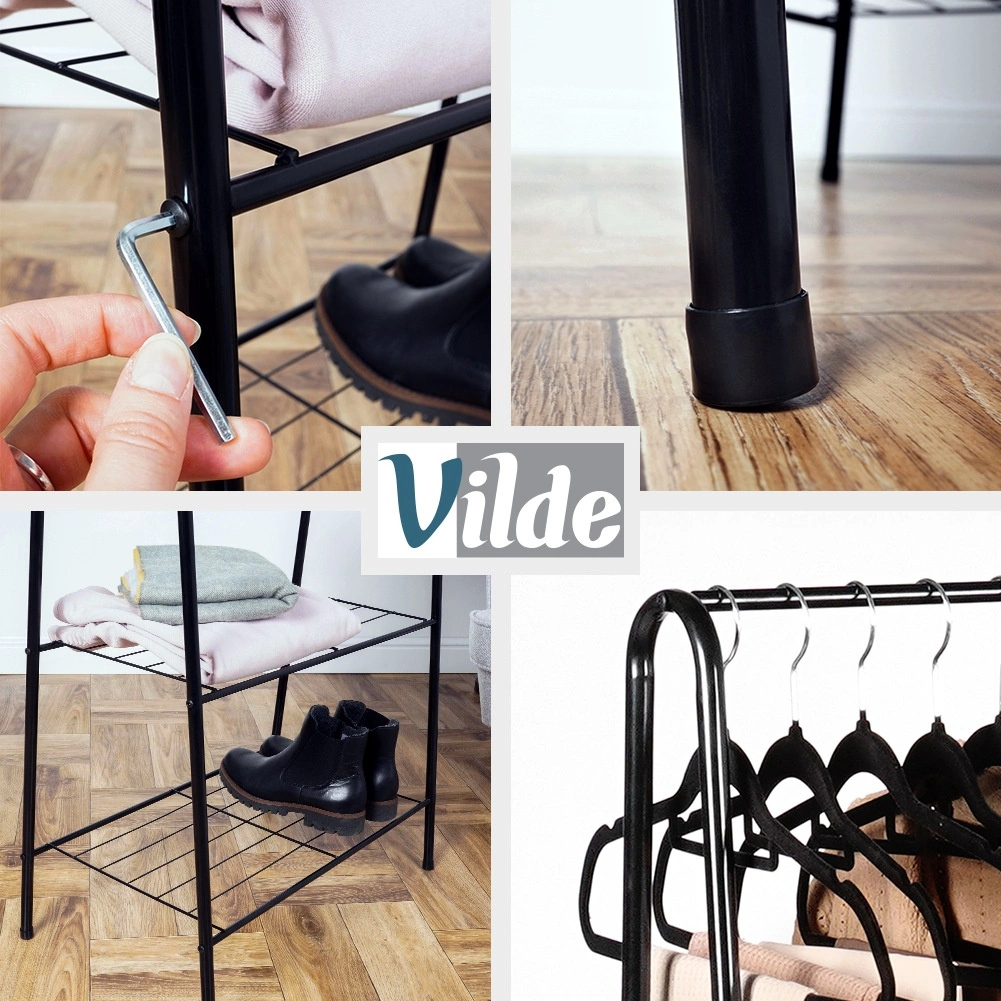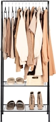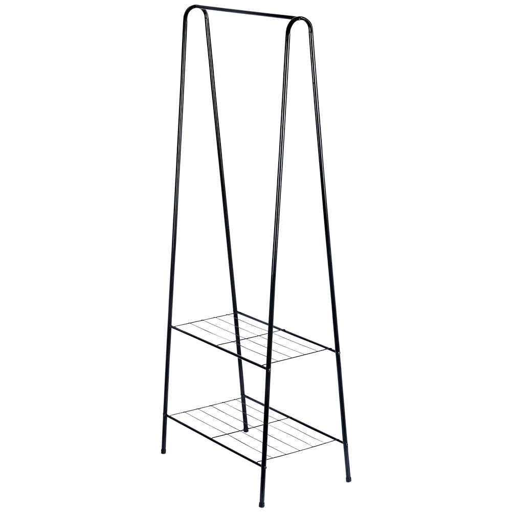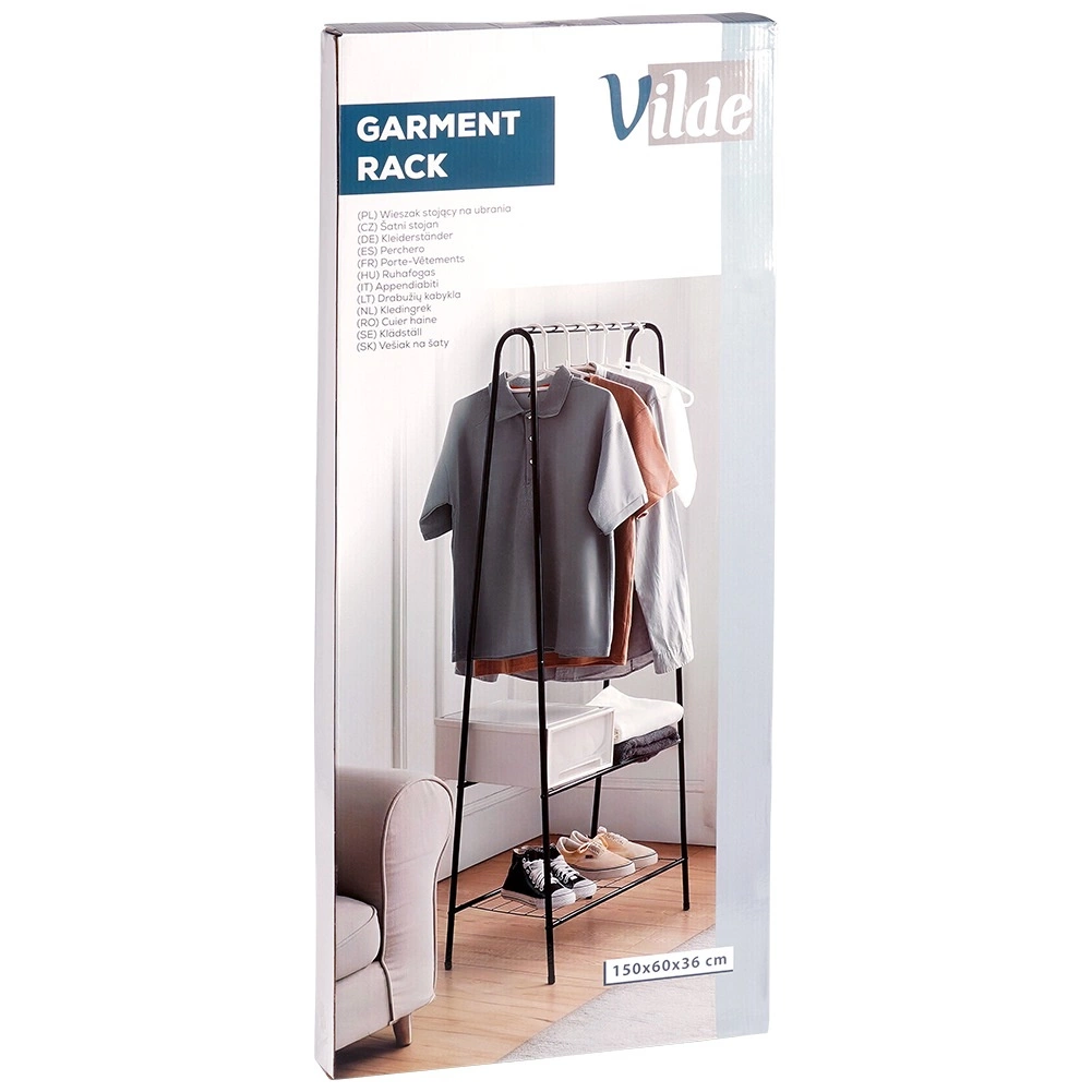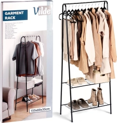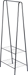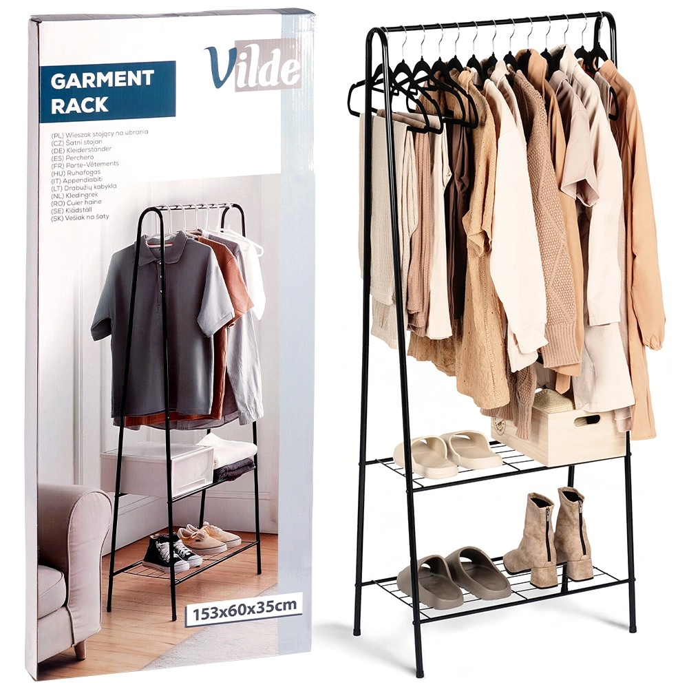 Tento volně stojící kovový věšák o rozměrech 60 × 35 × 153 cm poskytuje spolehlivé a elegantní místo pro zavěšení košil, kabátů či šatů, zatímco dvojice spodních polic udrží vaše boty, krabice nebo doplňky přehledně a po ruce. Minimalistický otevřený design snadno zapadne do moderních interiérů.