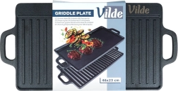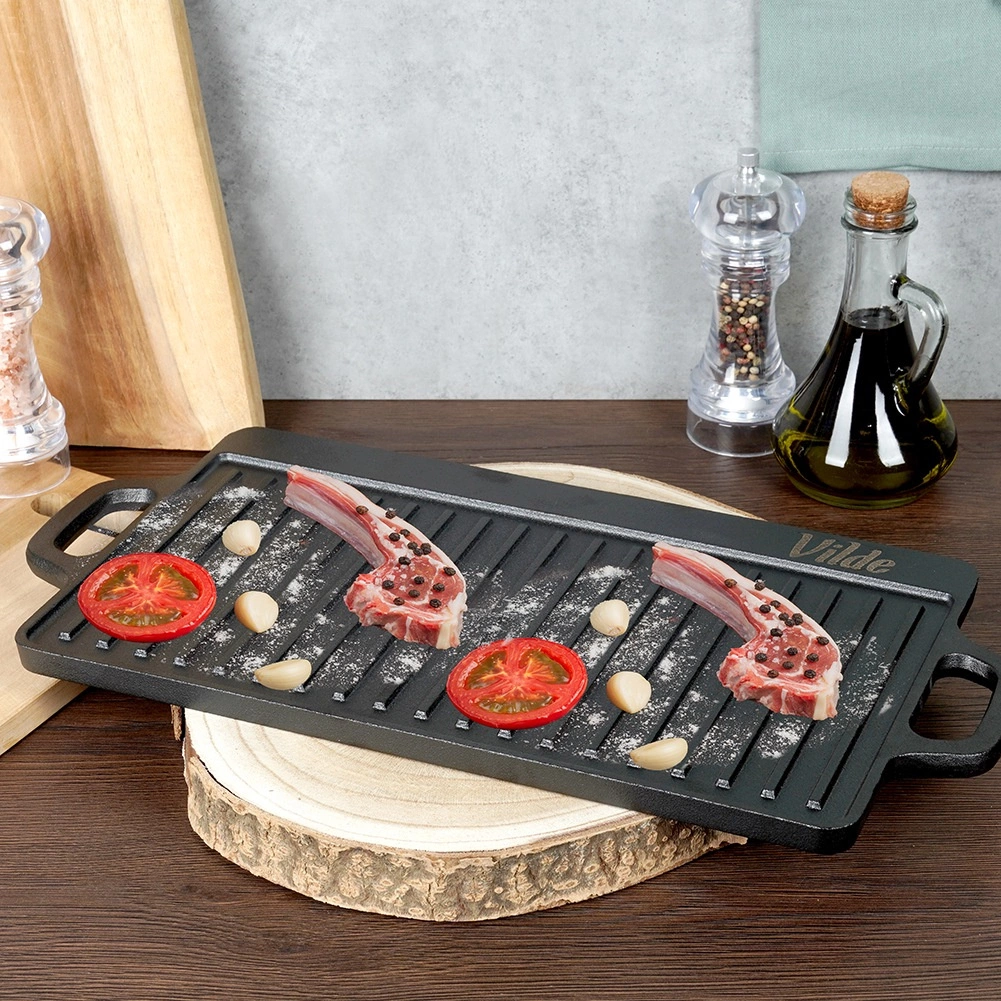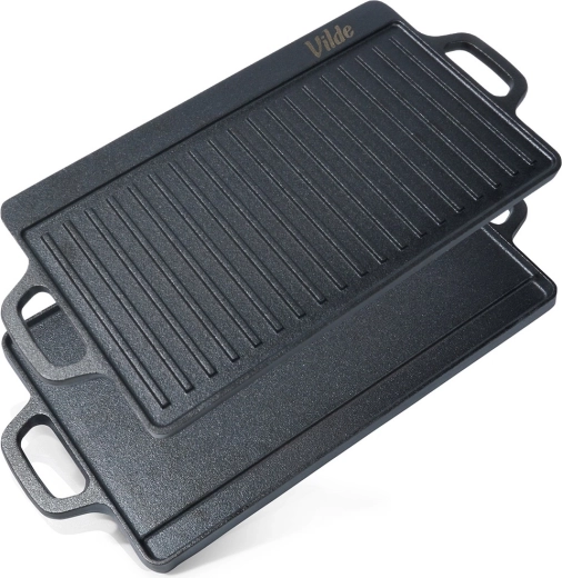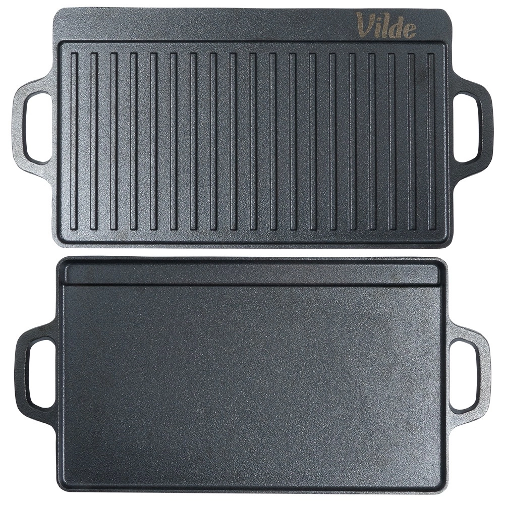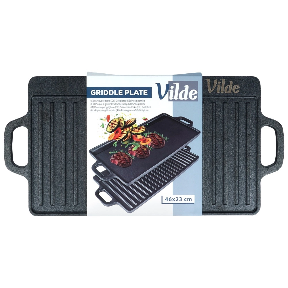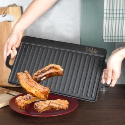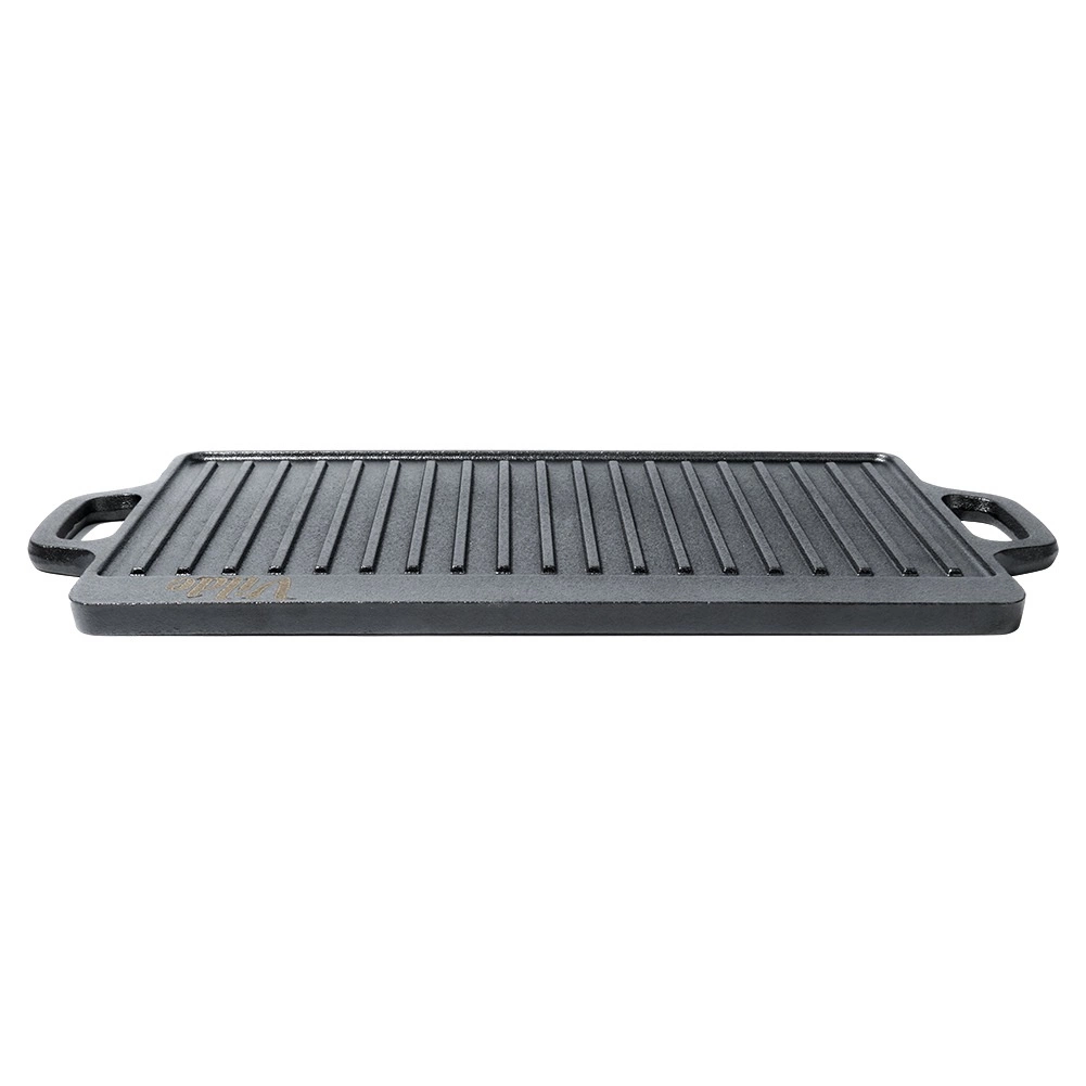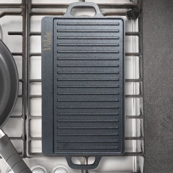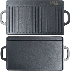 Tato robustní litinová deska je ideální pro grilování masa, ryb, zeleniny i steaků. Oboustranné provedení přináší maximální flexibilitu: hladká strana na palačinky, vejce či burgery a žebrovaná strana pro výrazné mřížkové otisky a odvádění tuku. Díky vysoké tepelné setrvačnosti litina udrží stabilní teplotu a zajistí rovnoměrné propečení.