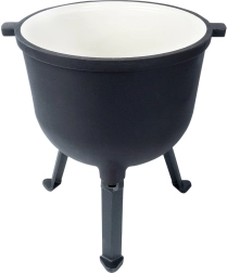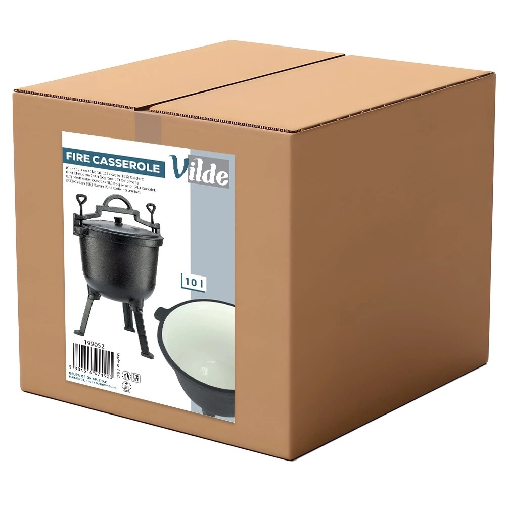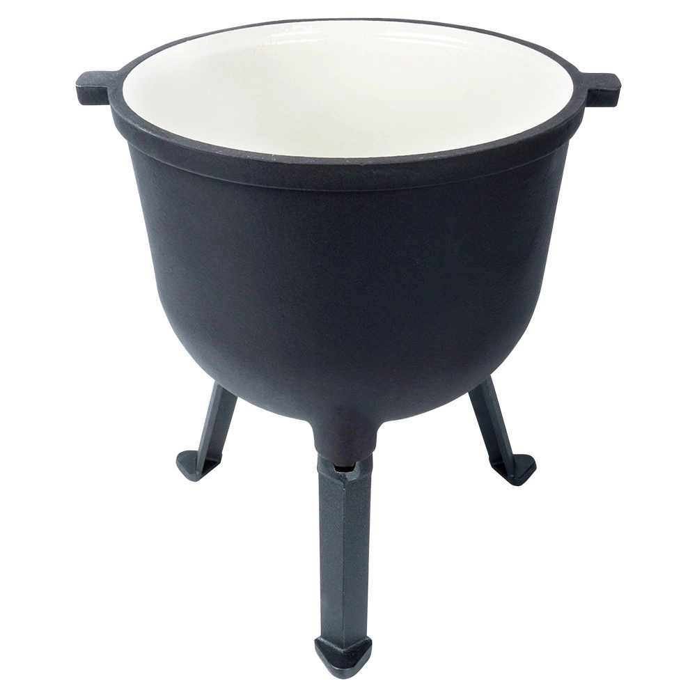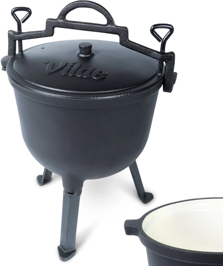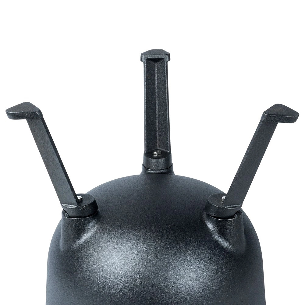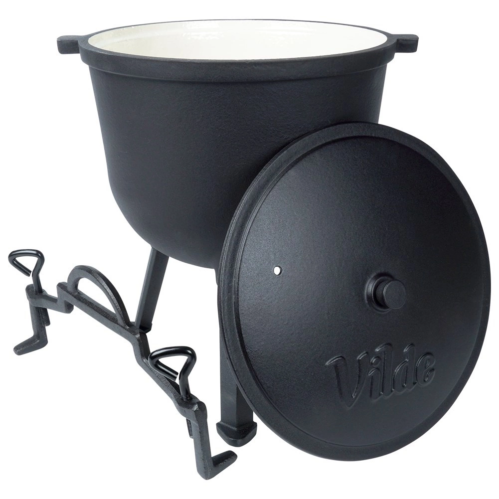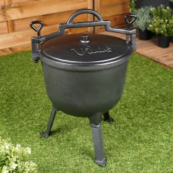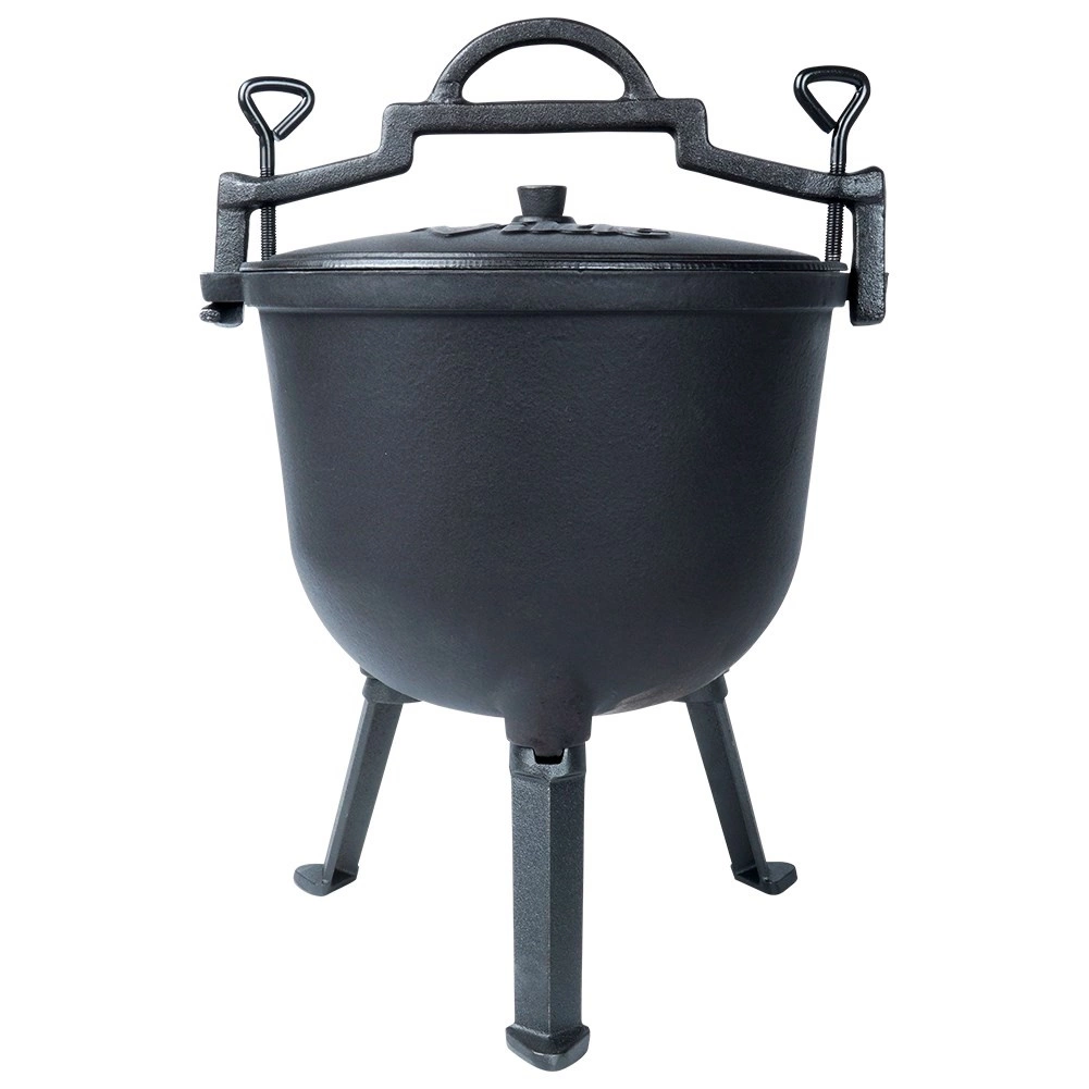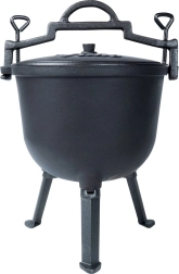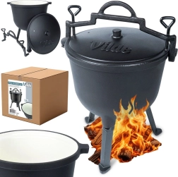 Kotlík stojí na třech stabilních nožkách pro bezpečné použití na ohni či nad topeništěm. Víko má ventilační otvor a dvě aretační šrouby pro bezpečné dovření během vaření nebo přenášení. Velké horní madlo a boční úchyty usnadní manipulaci. Ideální na zahradu, kemp nebo jakékoli venkovní vaření – jídla získají jedinečnou chuť a aroma.