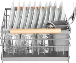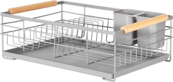 Odkapávač má vyhrazené sloty pro 10 talířů i prostor pro sklenice a misky. Dřevěné boční rukojeti usnadňují přenášení a dodávají výrobku stylový vzhled, který skvěle ladí s různými typy interiérů. Snadná údržba a odolné materiály z něj dělají spolehlivého pomocníka pro každodenní mytí nádobí.