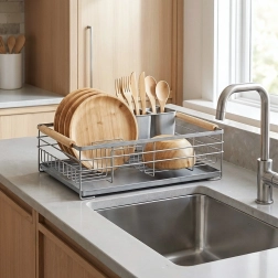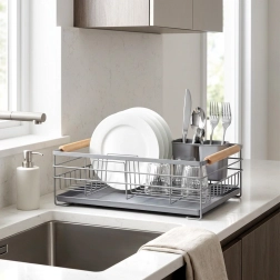 Udržte si kuchyň bez mokrých skvrn a nepořádku. Tento elegantní odkapávač na nádobí v šedé barvě kombinuje robustní kovové provedení s praktickými prvky pro každodenní použití. Vyjímatelná odkapávací miska zachytí vodu a pomůže udržet pracovní plochu suchou, zatímco dvoukomorový košík na příbory lze umístit dovnitř nebo z vnější strany podle potřeby.