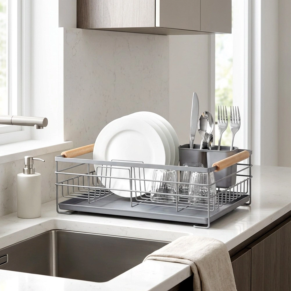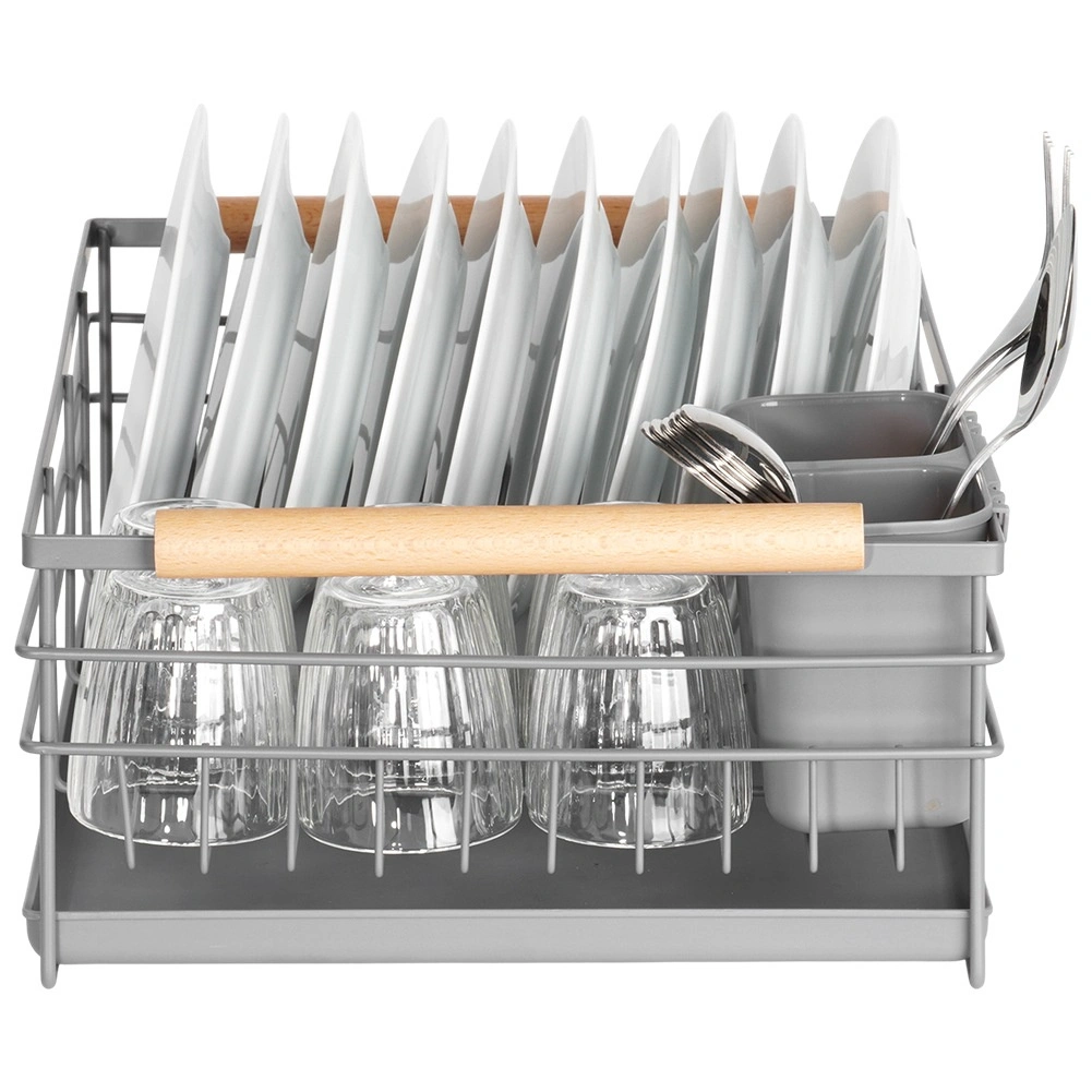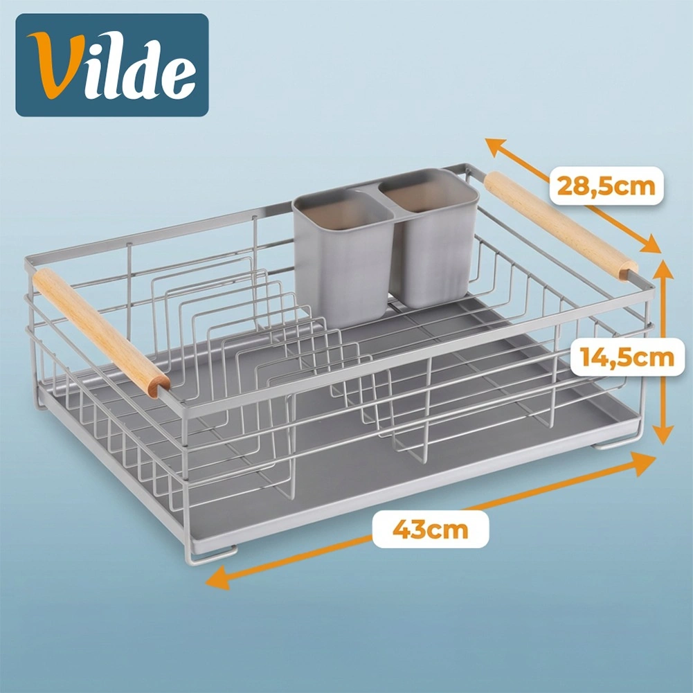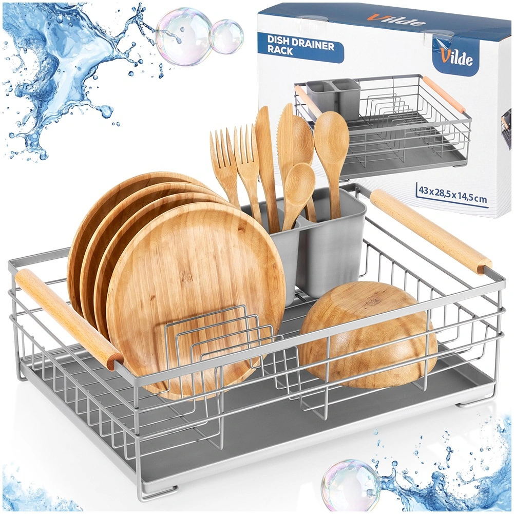 Praktický šedý odkapávač na nádobí s rozměry 43 × 28,5 × 14,5 cm přináší pořádek a sucho na pracovní desce. Nabízí vyjímatelnou odkapávací tácu, dvoukomorový košík na příbory a místo až pro 10 talířů. Díky pevné kovové konstrukci a dřevěným madlům je stabilní, snadno přenosný a skvěle zapadne do moderních i klasických kuchyní.