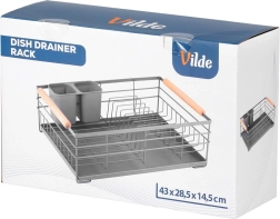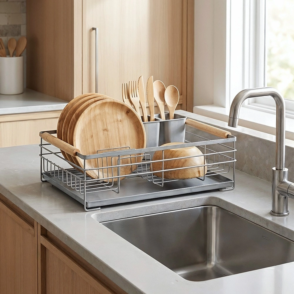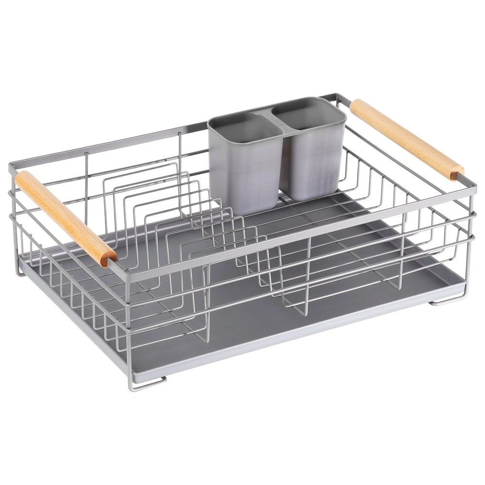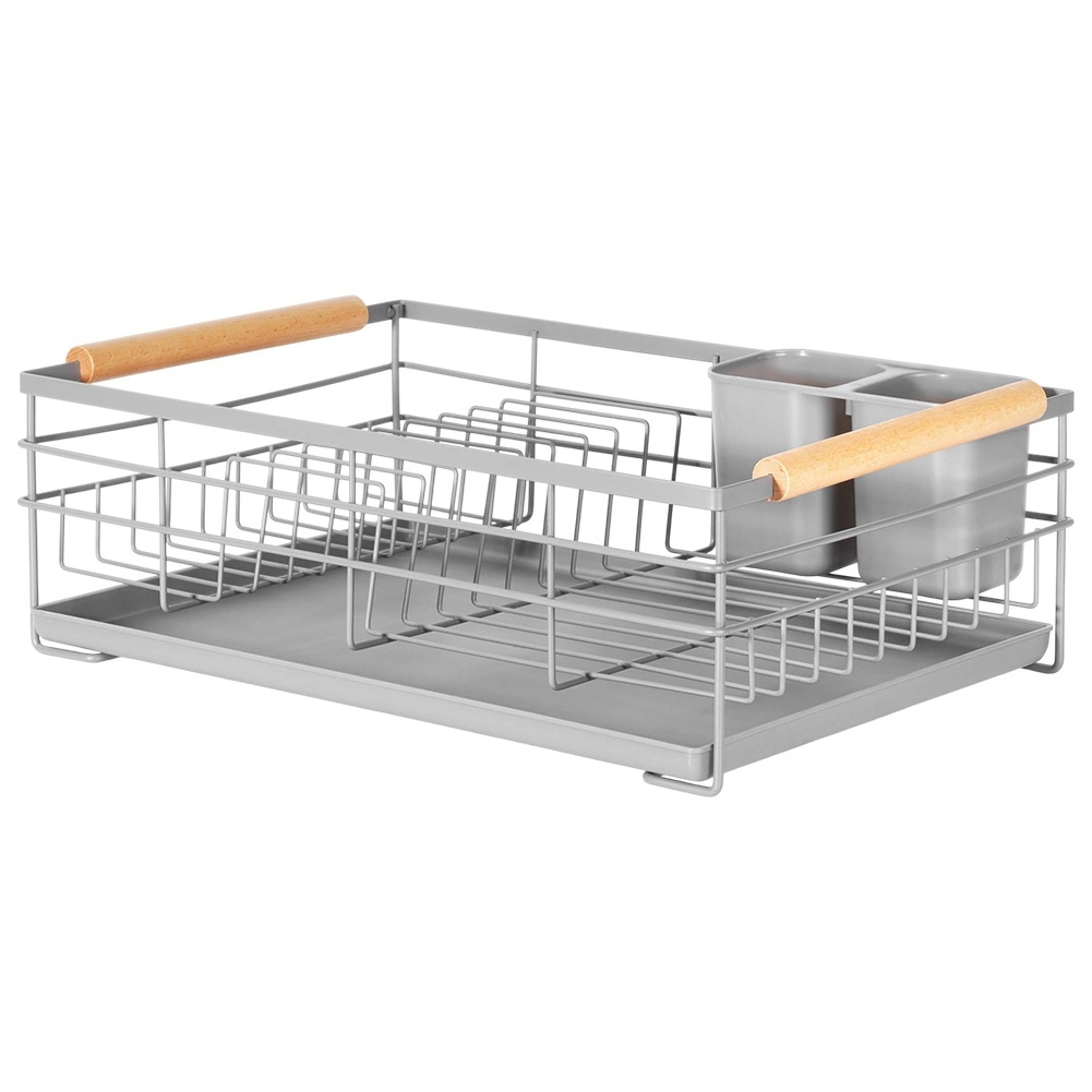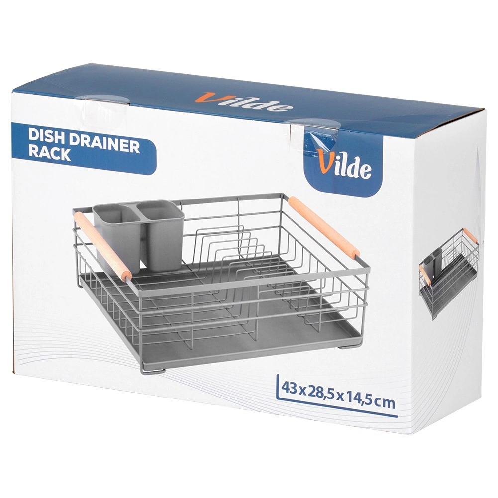 Praktický šedý odkapávač na nádobí s rozměry 43 × 28,5 × 14,5 cm přináší pořádek a sucho na pracovní desce. Nabízí vyjímatelnou odkapávací tácu, dvoukomorový košík na příbory a místo až pro 10 talířů. Díky pevné kovové konstrukci a dřevěným madlům je stabilní, snadno přenosný a skvěle zapadne do moderních i klasických kuchyní.