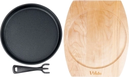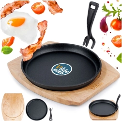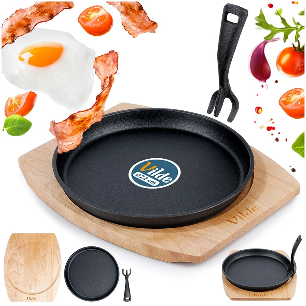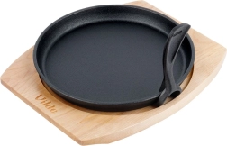 Tato kulatá litinová pánev o rozměrech 22 × 2,3 cm je stavěná na každodenní výkon – od intenzivního restování až po pomalé zapékání. Masivní litina výtečně akumuluje teplo a udrží pokrmy déle teplé, což oceníte při servírování přímo na stůl. Součástí je odnímatelná rukojeť pro snadné přenášení a skladování a přesně padnoucí dřevěná podložka (27 × 23 cm), která chrání povrch stolu.