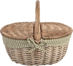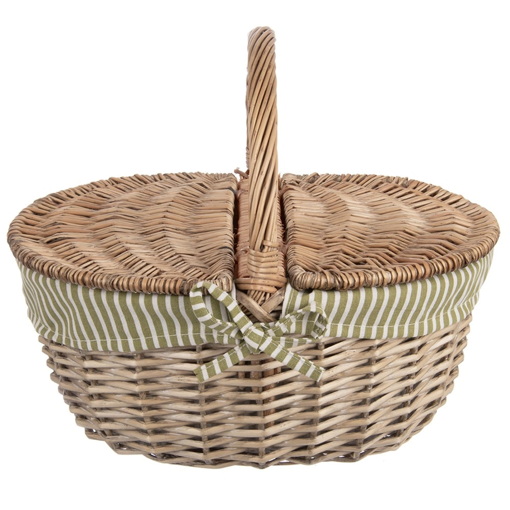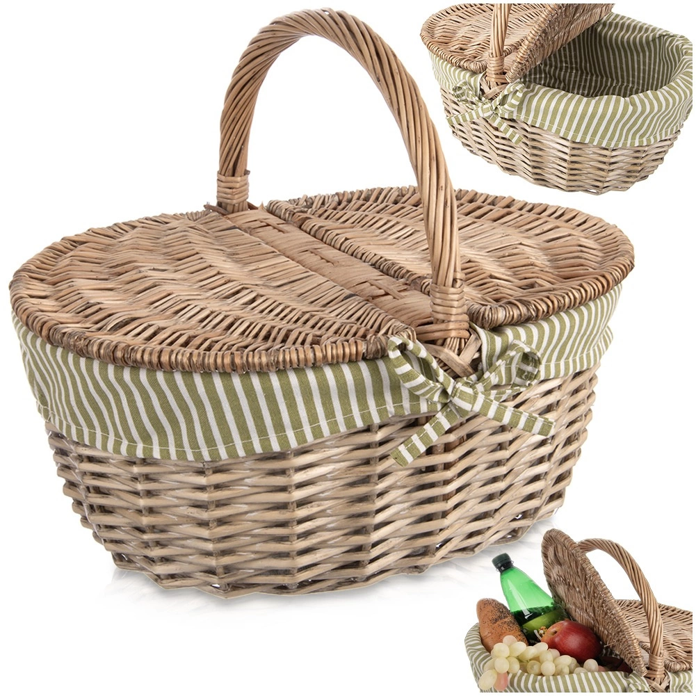 Elegantní proutěný piknikový koš s oboustranně otevíratelným víkem a pevným držadlem je ideální na výlety i do parku. Má vyjímatelnou látkovou vložku v zeleno-bílém proužku, kterou lze prát, a nabízí pevnou ruční výrobu z přírodní vrby, dostatek prostoru pro občerstvení a univerzální využití – od pikniku přes nákupy až po sběr hub.