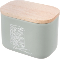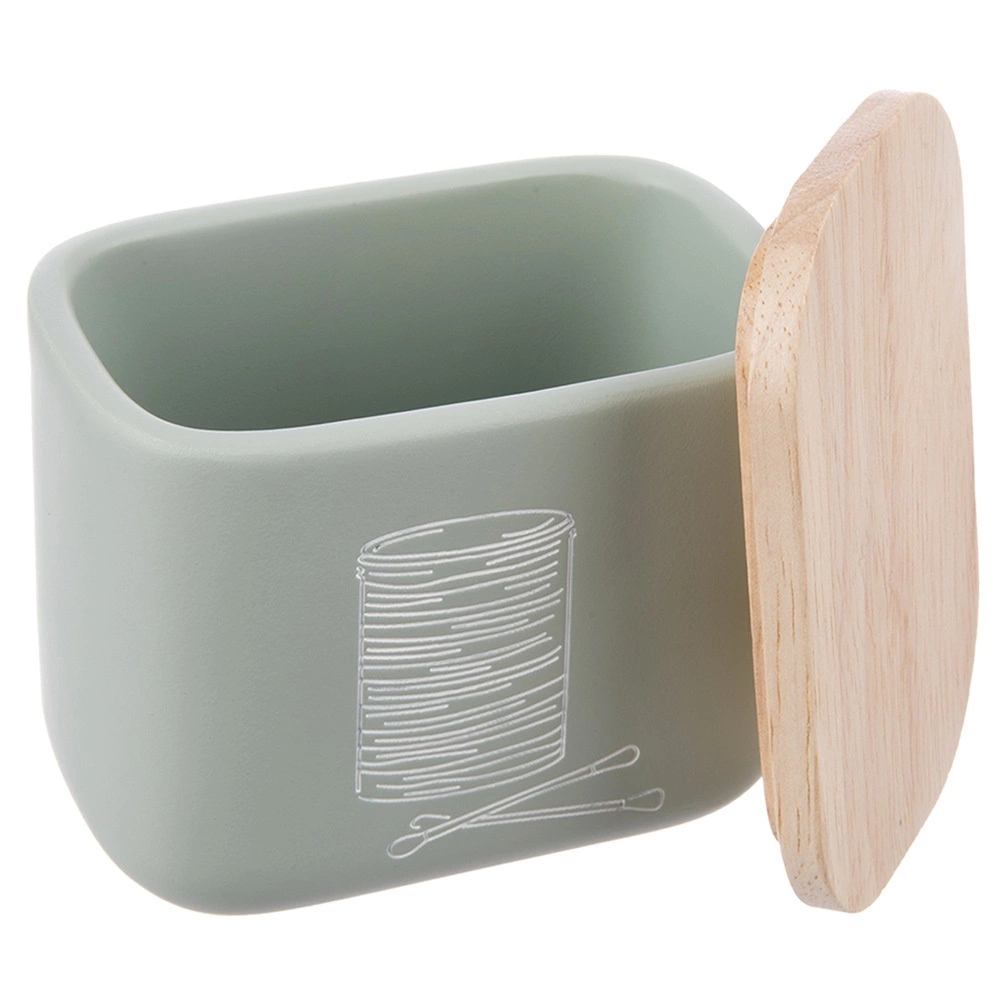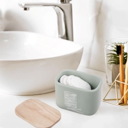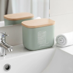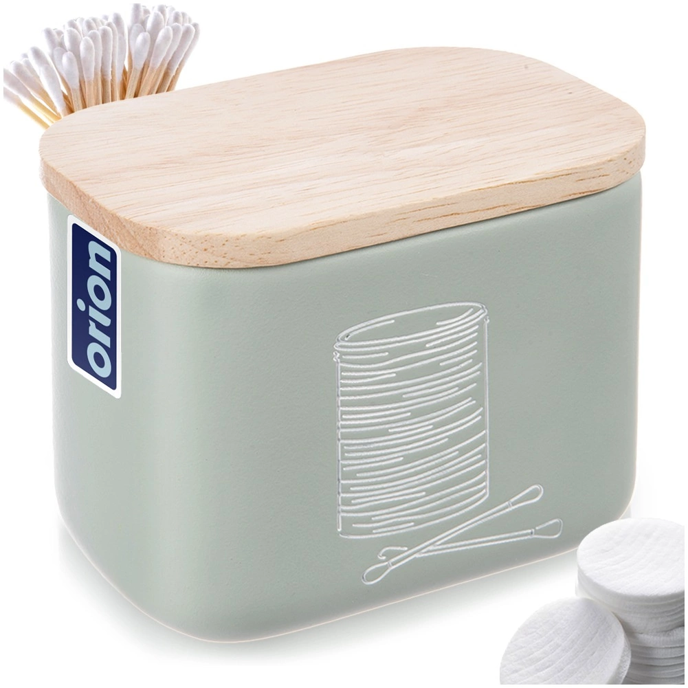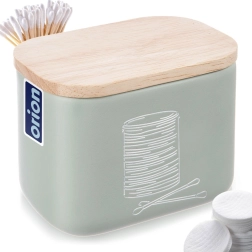 Stylový a kompaktní organizér do koupelny pro vatové tyčinky a kosmetické tampony se bambusovým víčkem. Z kvalitního syntetického kamene s vzhledem keramiky, v moderní mátově zelené barvě. Šetří místo, chrání obsah před prachem a snadno se doplňuje. Originální produkt značky ORION.