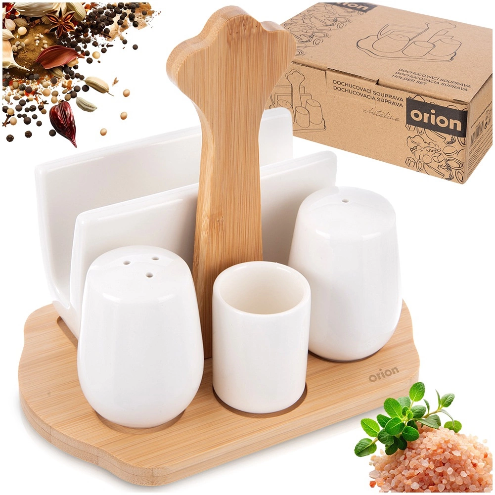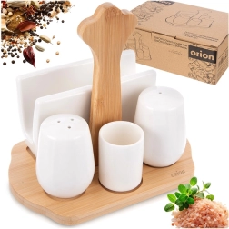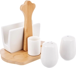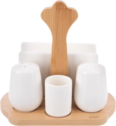 Elegantní 5dílná sada WHITELINE spojuje porcelánové solničky a pepřenku, držák na ubrousky a pohárek na párátka na stylové bambusové základně s madlem. Ideální pro každodenní stolování i slavnostní příležitosti, snadno se čistí a skvěle ladí s každou výbavou stolu.