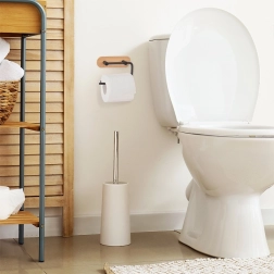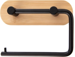 Elegantní držák na toaletní papír přináší čistý design a praktičnost do každé koupelny. Kovové rameno v černé barvě a bambusová základna skvěle ladí s moderními interiéry, zároveň zaručují odolnost a dlouhou životnost. Díky promyšlenému tvaru je výměna role rychlá a pohodlná.