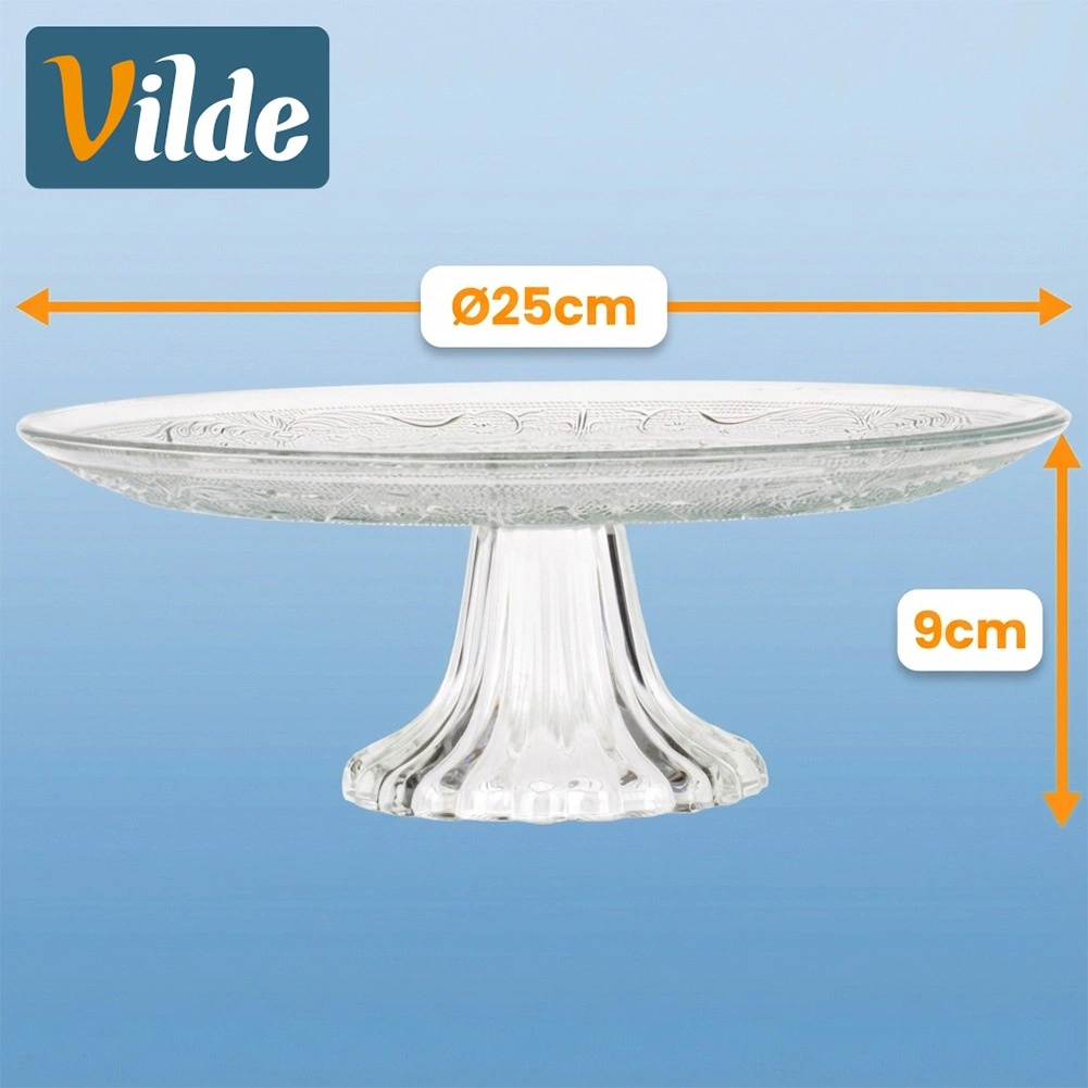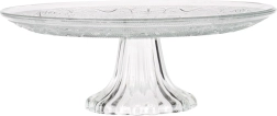 Elegantní skleněný podnos na nožce o průměru 25 cm pro stylové servírování dortů, koláčů a dezertů. Transparentní sklo se zdobením působí jako křišťál a dodá vašemu stolu luxusní vzhled. Díky zvýšené konstrukci vynikne každý dezert, podnos je vhodný do myčky a skvěle se hodí pro domácí i profesionální použití.